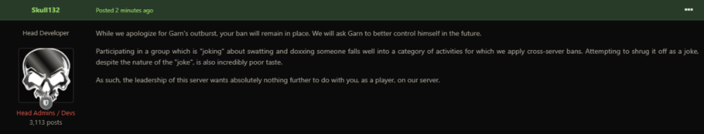 If people did doxx and try to SWAT him, I was never involved with those actions. I have never brought up what Apophis has or hasn't done because I genuinely don't care. I was indeed banned for supposedly belonging to a group that according to you (Unlike you claim, at no point have I singled out a member of the staff regarding the ban decision, and my "you"s are a generalization of the Aurora staff against which I hold no ill-will) planned or attempted to carry out a SWATting action against him. As for the point that my argument changed, I started my ban appeal with the hazy memory that I joked about this subject and that I didn't at any point involvement with actual illegal actions. I haven't backed out, I have ommitted information that I knew you had not to take a step in false because I did not have the screenshots and logs that you had, and as such I addressed each picture as it came up, which you tried to use against me to somehow prove that I belonged to a "group" involved with illegal actions. This was never the case, as there was no such group. These pictures were from a public discord and the people I spoke with were just other random people from the SS13 community who were equally disgruntled with Apophis' actions. Yet there was never an organized threat against Apophis that I know of and all my statements were purely made in jest. You're trying to strongly push what my intent and my thoughts was at the time, with being a third person to this joke that I made, as such, you wouldn't have context nor the understanding that I had as I wrote it. There was NEVER action taken or the INTENT of taking action through illegal means, which is to say I was never involved. If you do so strong-heartedly believe that I've done something illegal in the past I invite you to pursue legal action against me. In the case that you do understand that this wouldn't possibly hold in court as 1. It didn't take place and 2. There was never an intent, I suggest that you drop my ban as it originally was applied as a cross-ban for taking part in illegal activities, which you cannot prove the intent of. My argument hasn't changed, the thing that has changed from your part was my ban motive. As multiple times you've half-ackowledged the fact that I was at no point making a threat yet you've gone off to say how I should stay banned for making a distateful joke (in a different server). While the original ban reason was for suppossed illegal actions. Keeping me banned would mean that you still genuinely believe I have participated in illegal actions, which I deny. And if you don't believe I have, yet you still wish to keep me banned then you would be actively changing the reasoning behind the ban as to lock me out. If you can't prove that I've done anything illegal, then I suggest you retract your claims.