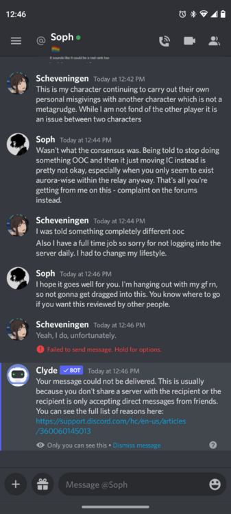 BYOND Key: Scheveningen Staff BYOND Key: Sophie/Peppermint(?) Game ID: Relay discord. Reason for complaint: "You were told to stop targeting people ICly and staff would handle the issue, but have continued now icly. Take time out to cool off" - Discord Ban length 7 days Evidence/logs/etc: So this was a surprise and came pretty far out of left field for me to see today when I got into my car to warm up and get ready to leave my place of work (it was snowing today!). Since it genuinely did not occur to me the context that this ban was actually for, I asked the banning staff member what this was about, because this discord ban of considerable length immediately confused me. I went back into the DMs I shared with Cybs, and then it occurred to me. It was about the Downfall Discourse.™ Anyway, I said the movie sucked, Sputnik said I was discrediting a "great film" depicting the last days of Hitler's regime, I said it still sucked as a movie, he replies by saying that I felt that because I was "very disconnected and distant from the events" - probably because I wasn't alive when the Holocaust happened, sorry, born in the wrong generation I guess. The conversation immediately ends after a few closing comments because everyone knows anything related to the discussion of WW2 is utterly dumb and yet it still gets brought up anyway. Moving on, this is the context of what Cybs told me "no", which was to not allude anyone to Nazi ideology. That's a very specific "don't do this on relay" behavior and that seems like a pretty acceptable request, given all discussion of WW2-aligned stories with non-experts always ends up very dumb. This tangent only exists to avoid posting the screenshot I replied to Soph with, which contained information of another staff matter that doesn't need to be brought up. I hate Downfall. It is a bad movie to talk about. Nobody bring up Downfall again. However, this has very little to do with what the ban reason actually appears to be, which is Soph accusing me of metagrudging through IC channels. It really was a waste of time to explain the Downfall discourse™, but none of this makes sense without that, as that bad interaction with Sputnik is being directly used as evidence for metagrudging through IC channels. The evidence I am later linked by Soph, however, only displays these two quips from my character against Arges. This needs additional context, so I will also cite a few witnesses of several strung-out relay conversations between Yasmin and Arges, and Arges with anyone else, for that matter. They can largely testify, for the most part, that any IC antagonism going on between Yasmin and Arges is business-as-usual rivalry and in-department shitflinging. @Misiek1001 @Sycmos @MattAtlas The following will be put into a spoiler as it is long and details that there is in fact, in-character goings on on my side and on Sputnik's. To the claim that I am metagrudging someone else because I am playing a character to be antagonistic to someone else's a specific way: It is not true. I have zero intent of pushing this person out of the community, and have not made any purposeful attempt to do so. While I have issues with Sputnik as a player, it does not mean I am out to get them OOCly - and again, nor was I intending to, my character was interacting with yours only. Nor did I have motivation to have their character pushed out from the server. I am not suggesting that the resolution for them is to "just deal with it," because that is callous and especially insensitive. I am open to talking to them personally to discuss it at this point, but that is not the point of this complaint. Assuming there was an investigation done on your staff's side of things, why was my input on my involvement in this situation never asked for, and why did you immediately decide to invest full confidence in your own, limited context, and then ban me essentially without warning? It is an insane investigative misstep to not question everyone involved prior to deciding what the proper action is. You presumed I was guilty and banned me without a conversation prior to it. Currently I feel like I'm the one being pushed out by staff in the only community circles that have any regular conversation which is the community discords, through being banned for a whole week without warning or open staff channels. You blocked me on Discord while I was in the midst of making my final remark, too, so this feels pretty especially personal, especially with the smug remark that "you don't even play" that seriously needs to be removed from community lexicon. It is effectively a passive-aggressive way of stating that someone doesn't matter because they aren't as involved in the community as the people who log on everyday. I cannot but think this is bad faith going on from the handling staffmember and the individuals reviewing this behind staff channels, because this appears horribly mishandled and I possess zero communication from staff about the progression of this situation. It seems more that you chose this was the situation that seemed convenient to remove me from the community space for a week.