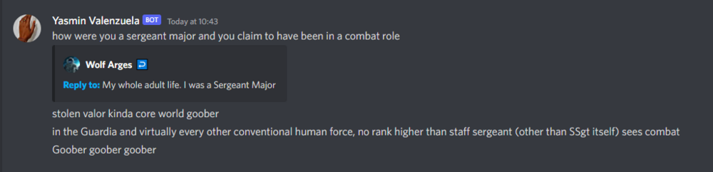 - If I do not see direct examples or evidence of this "OOC metagrudging" that is claimed, I am not going to be convinced that this ban is justified, and that and I will instead assert it was doled out arbitrarily and unfairly. - It is extremely easy to post many examples of someone's behavior and falsely assert malicious intent behind it. I am fully aware of another individual involved in a similar case who received dialogue in-depth from staff regarding their behavior, to the extent that person was actually given the opportunity to move on, improve, and keep playing. Why was the dialogue with the reported person (me, in this case) completely skipped in this case, and the assumptions regarding my involvement and intent immediately assumed to be true? On-server you're expected to actually speak to people regarding a reported situation in-game, and explain to them your reasoning before you issue a ban should that become necessary. Is this suddenly not the case with regards to moderation of the discord server? I know for a fact it is not, because the aforementioned "other individual" was not instantly issued a ban. - I have already stated the in-character antagonism between my character and Sputnik's pre-dates any negative gaffes I have had with Sputnik. The content and escalation of said IC antagonism has not increased or decreased since then, either, and by definition this is not metagrudging, because the behavior has been exactly the same. Mistyping the ban reason wrong the first time is one thing, trying to backpedal this into accusing me of metagrudging is incredibly insulting, as I am a long time player and I have never once done this, and never will. It is incredibly ironic for you to confess that "you've been away from Aurora from awhile" while also giving me that "you don't even play" spiel. This is deliberately smearing. - The idea that I have to ignore interacting with someone's character because of the assertion that I was asked to limit my OOC interactions with someone on the player side is not a rule and has never been a rule, nor is there precedent for it that I am aware of. It is neither explicitly against the rules to interact with someone's character in this manner (which, according to the above screenshots, is par for the course anti-Solarian antagonism if not generally below the average line, which is entirely on purpose on my side because I am fully aware to not be over-the-top) nor implicitly either. It is very off-base to extend rule 1 to issue a ban because my character called another a "goober." I have seen far worse stated and said on server between Dominians/Solarians vs. anyone else, and I see zero moderation or reports regarding that. So, what gives? - My attempts to DM you was to get much needed context as to what was going on on your (the staff's) side that nobody deigned to even screenshotdump exactly what I supposedly did 'wrong' and then ask me to explain it. I believe it can be universally agreed that you should talk to someone, with provided evidence in hand to refute any bad faith arguments, before banning them, yes? I am extremely easy to talk to when I am given the base level of respect that any human being should be given when prodded with a serious issue, and when I am allowed to explain myself or ask questions for context. I become much more difficult to talk to and get frustrated when I am treated like garbage and that I am not given a civil explanation for anything - nor the chance to get more than surface level information when something I don't understand happens, like any human does. - My personal view is, I do not think the basis of this ban is correct, nor do I think how you carried out your responsibilities as a volunteer of the community was fair or correct, either.