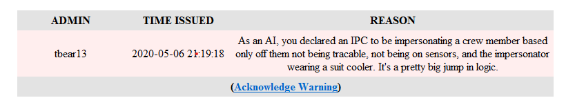 3. BYOND Key: XanderDox Staff BYOND Key: All of these staff members were online when Tbear told me they all agreed with his belief, so this complaint is against all of them. Game ID: b62-cy85 Reason for complaint: I think the reason for the warning is farcical and overly attempts to control how players make decisions or play their characters. Evidence/logs/etc: Additional remarks: From the rules: I was warned for metagaming by Tbear, because I determined using inductive reasoning and logic, at almost end round, a crew member was a 'criminal'. Jacqulen Roberts had been beheaded by an Officer during an arrest. Shortly after, someone came on comms saying THEY were Roberts, and that they had used plastic surgery to disguise another person as them. They deliberately asked me to come look at them on cameras, take a picture and confirm they were Roberts. When I did this, I noticed they were wearing a suit cooling unit. I know as an AI, that suit cooling units are only used by IPCs to prevent heat-death. I then realized that there is an IPC Officer, 'Omen', that had direct access to all of Robert's confiscated gear (a Banshee Hardsuit) that the Fake Roberts was wearing when they called me, they were also wearing a security belt. Knowing this, I then went to check the locations of the other IPC crew, none of whom were in spacesuits or space at the time. Only Omen was untraceable and off sensors, and he suspiciously had not been heavily involved in the Bridge Raid to capture Roberts and Thompson. It was at this point that over the Security channel, I informed Security of my determination. As soon as I said this, Omen/Fake Roberts confirmed my theory. It was near round end, I used completely in game facts and information, the antag did not seem mad, and there was no metagaming involved. I believe that once again, I am being targeted by staff over petty issues in hopes to remove me from the community.