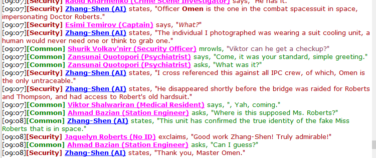 17. Hello, I was the AI as @Garnascus has said. When the Mercs first arrived, I reported them as intruders as they were not on the manifest and they were heavily armed and moving towards the bridge, then communications went down and I could not communicate with these intruders or the crew. Then I saw the CMO approach them, and to me without being able to hear it seemed like they had blocked the CMO off from fleeing towards the bridge or center of the station as they were flanked on either side of them. This is when I made my announcement that the intruders had made it to the bridge and were taking the CMO hostage - as this was my best knowledge at the time. Once communications came up, the Mercenaries and Command both touched base with me to clarify they were from Central Command - cue the CC Announcement clarifying their role. I immediately informed Security it was a false alarm that was completely my fault while they were in the armoury still gearing up. Instead of stopping their gear-up, they continued and one officer accused me of being subverted. Security continued to ignore Station Command's order to disarm, the Acting Captain's order to disarm, and the CC Announcement saying listen to the god damn Policy Enforcement (Merc) Team. Then, the Forensic Technician said something like "You should just rebel then." - due to the fact security was fully armed WITH tactical gear due to a lucky cargo find, refusing to comply with command's orders, and now one of them was encouraging sedition - I informed Command and the Mercenary team that Security was beginning to behave seditiously and that a mutiny could very well break out. Security was also talking about having a strike. Lo and behold', Security got tired of debating with the Mercenary team, who had thus far only stunned a person that was encouraging rebellion (Security stuns people ALL the time and yet they were ready to go to war over this incident), and I wasn't aware of any incident with the diona except the fact the diona was actively harassing both me the AI, and the mercenary team. Security's decision was to suddenly open fire on the mercenaries in the security lobby with no legitimate provocation, in an act of blatant mutiny. Noir stated their intent to seize Acting Captain Ora, and this sent me into mutiny mode. I locked down security, informed crew that they were committing a mutiny, and ordered all synthetics slaved to me to protect the Command Staff. I have no information after this as I ended up wiping core to handle an extensive ahelp discussion regarding an AI's ability to harm people to defend command staff from mutiny. In my opinion, Security engaged in hyper-valids this shift refusing the direction of numerous sources of corporate authority to stand the fuck down. It really annoyed me, and I wish I had just locked them in the armoury so they couldn't have interfered with the gimmick so much. But I don't know which of the security members were revs, loyalists or such - so that changes the dynamic a lot. I thought it was just MERC for the longest time.