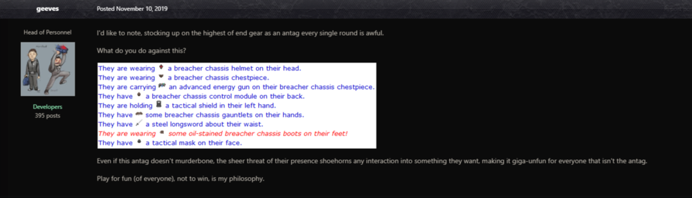 Indeed, it was an oversight. Yes, by @MattAtlas . And I responded on discord in #Code Dungeon, and thanked him for fixing it because I didn't realize my mistake. Everyone makes mistakes. As for the other part of your post... 1) Why does this matter for a mod. No, genuinely, why does this matter for a mod. Moderator that understands the game deeply is a good thing, no? To be able to help people. 2) I disagree. I think you're unable to move beyond the past. 1) Okay. If you won't like me taking a ticket in regards to you, you can always request someone else to take it. 2) Trial mods are very carefully monitored by other staff members AFAIK. If I'm being dumb, I'm sure it will be shown. 1) I have used an Unathi Breacher as a merchant 2-3x as far as my memory serves. And once as a Ninja for a Promise gimmick [hired merc bodyguard] which I found in the vault. 2) This was already resolved by @Marlon Phoenix. Who, might I add, has posted in this thread already. As you can see on the time stamps, that is quite the old discussion. 3) I'm the person who made this post complaining about validhunting from both antagonists and security https://forums.aurorastation.org/topic/13124-murderboning-antagonists-and-validhunting-station-crew/. In said thread, you yourself brought up the issue of the breacher-equipped character. This complaint is one you have been bringing up on every single one of my posts where I am looking to try to do something for the community, always with the same notion that because I used a breacher a few times I am a sinner and must forever be stuck in the pits of hell and should be banned from the server. At least that's how it appears to me anyway. I think there's something to be discussed here, because Geeves, we both know that this post was not made because you genuinely are concerned about the breacher. This post by you was made in response to my first reaction upon playing the newly added IAC distress-beacon-response team. Due to the fact how ill-suited for the current situation on station IAC was, I was very displeased and you argued against my points that having an ERT that cannot aid anyone is alright because it's a distress beacon and you never know who picks it up. AFAIK you were the one who added IAC and honestly, it is a good piece of work to add a new response team. I wouldn't know where to begin. The situation in the round was complicated, and I couldn't do anything to help anyone, as the IAC team was not equipped the handle the situation we were called into. I find the timing of your -1 on my application and our discussion about your work very .. coincidental. FINALLY last point: My last rounds as antagonists that I remember were: As Augury [scientist] I bought a laptop and used captain access to rp-out a hacker by the name of Overlord or something somesuch. This hacker was trying to remotely help his agents [other traitors] in their work by listening in on comms, missdirections and creating distractions. Total amount of attack logs vs players: /0/ As a wizard, I ahelped to be turned transparent and named myself NT-RCS-1 and was a baseline. I had the wiki up and open on IPC and Timeline pages and rp'd out a story of a baseline that was there during construction of Aurora 1 who somehow due to bluespace shenanigans ended up being a 'ghost' on our current Aurora. Total amount my character attacking others: /0/. Total amount my character got attacked: 4-5 as far as I remember. As 'Icelander' the merc I got spawned in with someone who appeared to be a newbie during a secret bughunt. We agreed on a gimmick that we are going to station for an unrelated job, and then we will stumble upon the borers and switch priorities because the mercs will believe that getting borer powers will make future jobs easier. The merc-newbie turned out to be rather psychotic and we had to hole up in our ship for over 50 minutes in order to get him to calm down and stop attacking everything in sight, after which me and the other merc who were still active [The last one gave up and just ghosted after asking 'mins for replacement AFAIK] were attacked and seriously wounded. As we have done absolutely nothing in the round due to the uncontrolled violent tendencies of one of the mercs, me and the last merc tried to salvage the round in last 15 minutes and decided that every bug must die. We had no way of proving this, so we just asked everyone if they are infected, and clearly communicated our intent to kill all infected and bugs via two announcements and multiple radio channels. In two of those gimmicks I did not perform any validhunting at all, and mostly used standard equipment issued to the characters. In the third round I spent most of my round actively getting in the way of a murderboning antagonist and trying to create some form of a storyline from what was left when it went up in flames. I strongly disagree with your sentiment that I am 'merely' a powergaming, validhunting person that does not deserve to help people because they don't know how to rp. Make a valid point against this application if you are to oppose it. -