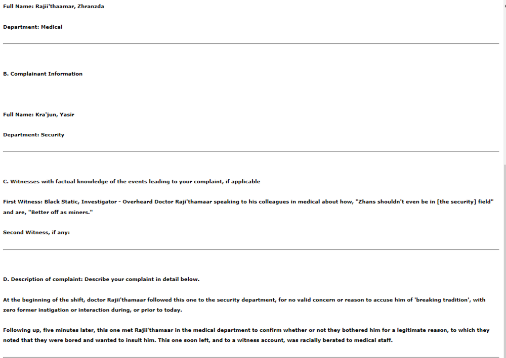 Reporting Personnel: Kra'jun, Yasir Job Title of Reporting Personnel: Security Officer Game ID: ck8-aRHr (Not sure, closest to the date and time on #game-status) Personnel Involved: - Kra'jun, Yasir, Security Officer - Victim - Rajii'thaamar, Zhranzda, Surgeon - Offender - Black Static, Investigator - Witness Secondary Witnesses: N/A Time of Incident: Approximately 25-35 minutes into the shift. Real Time: ( ~0100EST(GMT-5) 11/28/22) Location of Incident: Security Lobby, Medical Lobby Nature of Incident: [ ] - Workplace Hazard [ ] - Accident/Injury [ ] - Destruction of Property [ ] - Neglect of Duty [ ] - Harassment [ ] - Assault [X] - Misconduct [ ] - Other _____ Overview of the Incident: Around the first thirty minutes of the shift, this one was conducting his standard routine, checking in with the main public areas. When he stopped by at the security lobby to check in on the bounty manifest, this one noted that he was followed by Zhranzda, whom stopped in the middle of the security lobby. Whilst he was chatting to his colleague in Basic, the doctor spoke to this one in Siik'maas, remarking in a tongue-pierced manner of his use of the word 'we', in a perfectly appropriate context. This one promptly corrected the doctor, noting that it was a pointless nitpick, and should not concern him how he uses basic to be comprehendible to his colleagues. Whatever the case, this was quickly diffused and the both of us returned to our job. After he was finished with business at the Operations department, he stopped by at the medical lobby to inquire with Zhranzda to inquire whether or not he had a legitimate concern to report, instead of offering their unappreciated input. The doctor answered bluntly and claimed that they were 'bored' and 'wanted to insult him.' During this next segment, he will note that he was not directly present for this at all. While he was overlooking the service wing, investigator Black Static approached this one and pulled him aside for a chat. They notified this one that Doctor Rajii'thaamar had found it appropriate to share vulgar opinions in public, particularly in the medical lobby with staff of the department, and audible enough to those in the hallway. Following this, he proceeded to draft up a written document of the events, and before he could present it to any head of staff, he was pulled away for unrelated matters. Submitted Evidence: Would you like to be personally interviewed?: [ ] - Yes [X] - No Did you report it to a Head of Staff or a superior? If so, who? If not, why?: Yes, Doctor Hailey Wise. Actions taken: None, due to an ongoing security ledger this had to be postponed. Doctor Rajii'thaamar and himself had concluded our shifts by the time this could be handled. Additional Notes: This one does not seek a thorough investigation, it is much preferred that this incident is filed and documented with the offender notified and reprimanded, since there was not enough time to properly follow through during the shift.