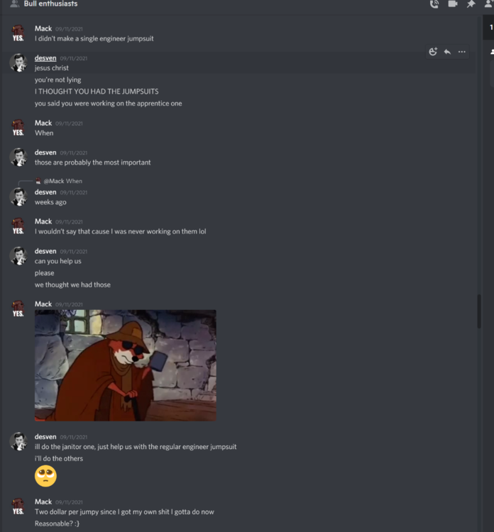 Hi. I have a pretty big issue with this app. That PR you linked for the additional bully clothes contains none of your work. It is all Desven's. Neither of us appreciate the fact that he was not even mentioned with that link, and it sort a feels like you are trying to steal credit here. On top of that, I have issue with how you handled the Bulwark clothes you DID do as well. You originally agreed to do a small number of Bully outfits, just the ones for job uniforms and that was it. Desven took it upon himself with me later joining to sprite most everything else, but what you ended up doing is spriting a few clothing items, then doing next to nothing for multiple weeks after making your Skrell dev app (this is when Desven started spriting everything else, by the way), and then you came back and told us that you refused to do what you agreed to do until we paid you because you "Have actual responsibilities now" despite agreeing to help with the clothes prior, effectively holding the project hostage for money. Here is some proof of the above. To reiterate, Ryver agreed to do the sprites Desven is asking him to help with far prior to this. Originally, I had not planned on saying anything, but this blatant theft of credit is really the final straw for me, and I cannot in good conscience condone this application. -1 -