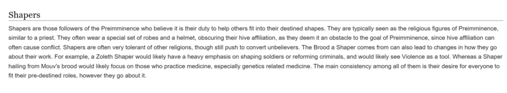 Type (e.g. Planet, Faction, System): Religious Figure Describe this proposal in a single sentence (12 word maximum): Add an actual portion describing Shapers on the wiki. How will this be reflected on-station? It is already in game. Vaurca can choose to be a priest and select shaper clothing in the loadout, though there is no representation of this on the wiki, thus this app to make it more clear as to what Shapers are. I feel this is necessary as seeing Shapers in game can be weird and no-one really knows much about them, and cant really even look it up. Does this faction/etc do anything not achieved by what already exists? Nope, it is already in game, just wanting to solidify it on the wiki. Why should this be given to lore developers rather than remain player created lore? It is already up to the loredevs, as it is already in game. This is to clarify on the wiki since there is not other explanation. Do you understand that if this is submitted, you are signing it away to the lore team, and that it's possible that it will change over time in ways that you may not forsee? ??? Long Description: Shapers are Vaurcan followers of the Preimminence religion. They are really the only religious figures in Vaurcan society right now that are sort of priest-like. They are typically similar to counselors and seek to help people follow what they are meant to be in life so that God can form. To really explain what Shapers are, it is important to understand wtf Preimminence is, so I will now Copy paste that part of the wiki now Notice the Bolded part, this is the only real definition of Shapers, and it really isn'tmuch of a definition as it is a very broad definition of followers of the religion. Shapers lead the charge in shaping people's destiny whereas mainstream followers would just believe in it, maybe assisting where they can. I feel this is a important clarification because if all the followers were shapers than it is likely any brood following the religion would not be doing anything but that, making it pointless as I seriously doubt an entire brood is meant to be shapers destiny-wise. Especially since it says all followers believe it is their duty to do so. So if they were all doing it, then no-ne would be doing their Job, defeating the point. So my suggestion in full is to add a part onto the wiki About shapers, and change the bolded text above slightly. The normal text is what is already existent, the Bold text is what I want to add/change. I feel this is a necessary addition due to the fact that shapers exist in-game, but are hardly ever played. I believe this is due to the lack of information making players fearful of playing the role, not wanting to screw it up. Thus a segment discussing them is necessary in my opinion.