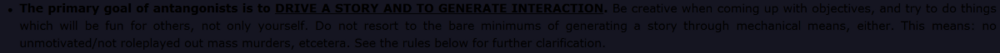 I am going to preface this by saying that I do not know you. Like, at all. That being said, it makes NO sense to say that I personally targeted you despite having absolutely no clue who you are. Secondly, you did break the rules. Your gimmick was to board the station, crack the vault stealthily by your own admission, and leave. This provides ZERO interaction with the crew and in the event the mercs get caught, which you were, it ends in all the antags being killed/arrested/fled by 45 minutes in, which is exactly what happened. This is against the rules because it generates very poor antag interactions and basically invalidates the round for everyone else. There was no narrative, and no story. Your claim that it is not written in the rules is blatantly false. Here is a screenshot from the tab that opens when you click 'Rules' on the UI. By the phrasing of this rule, you blatantly broke it by your own admission. I never told you that you were not allowed to finish the round. You by all means could have stuck around and played for the rest of the duration if you wanted to. Additionally, your platform of notes and bans were related to your antagonist play. Most of them were due to escalation, but all of them still stemmed from antagonist play. We do not look for super specific notes to influence our decisions because it would mean people would constantly break different rules and never get punished just because it wasn't the same exact circumstance every time. You broke rules so often as antag that you have warnings and even bans stemming from it, so you have lost all benefit of the doubt when it comes to your antagonist play, and hence why I placed a permanent ban. You simply do not understand what playing an antagonist properly is. -
