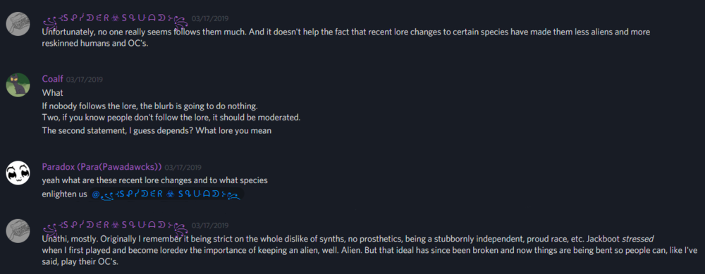 Just recently we had a massive project that involved virtually everyone in the lore team, the offworlders. Almost everyone contributed, no matter what race they are technically attached to. You basically provided zero input besides playing a minor volunteer role in an event, despite being a main species maintainer. Same with a lot of projects, actually - a lot of loredevs work on a lot of things that are not just related to their race, and don't technically "involve them". Exactly, you are a volunteer. Nobody forces you to be here, yet there is a limited amount of loredev slots. If the server causes you anxiety, you disagree with where it is going, and you would prefer playing somewhere else, why are you still occupying your position? Why haven't you even opened deputy slots? That's the main point I am making in this complaint; everything else is secondary. That is completely not what I'm talking about. The thing is, the input you have chosen to provide in weeks is not even critique, it's just "Unathi aren't good anymore" which was only tangentially related to the topic at hand at the time. If you actually had productive input at other times, that would be fine. Suddenly popping up out of nowhere with it isn't. By the way, you're the one who made it personal. If only you actually ever said or critiqued something. Our interactions pretty much end with the end of that server, and a thing you pinged me with recently when I was talking about skrell lore. Which I didn't take any offense to despite it being a mild criticism of my work. I will let Paradox speak about other screenshots if he so wishes. Now as to the cheeky announcement, a PR involving Dionaea that was made recently, and what Jackboot told me. While I am somewhat glad that the complaint actually got you to do something, I fear that this minor boost of activity will end, and you will be absolutely inactive again. You've been inactive since my tenure in staff began, which is I think about four-five months ago. I just can't see you picking up a new pace so suddenly. And I also seriously don't see why you can't be a deputy instead of a main species maintainer if you truly enjoy working on lore so much, which I have my reasons to doubt. This complaint was not made to demean you or to say that you're a bad person; simply to point out that you are inactive and seemingly prefer playing another server. Considering the race that you are supposed to maintain is basically dying, something needs to be done about it. I will refrain from further replies until someone chooses to handle this complaint. -