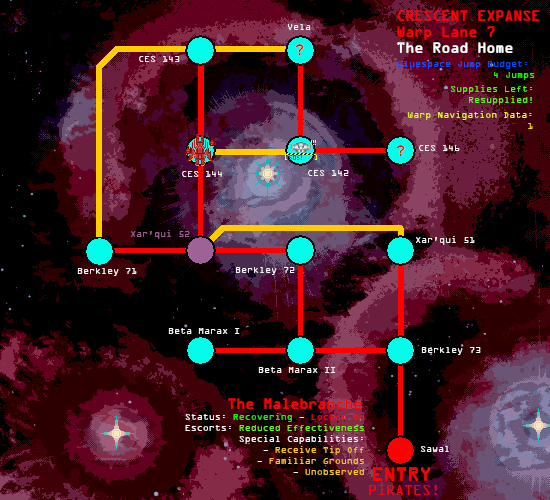 Crescent Expanse: Warp Lane 7 — Week 3 ——— Bridge Memo: Ship Navigation Good morning, Command and Bridge Crew, The SCCV Horizon awaits course adjustment after evaluation of the vessel's current situation. Following the incident at the hivebot-infested propellant depot, a number of important developments should be noted: The SCCV Horizon was able to salvage 1 weeks worth of supplies from the derelict, as well as the surrounding graveyards of hivebot robot debris left by the Purpose synthetics. This is only enough to recoup what was lost relocating to the system. Scans prior to the derelicts detonation, a successful attempt to interrupt the worst of the hivebot interference of the SCCV Horizon, indicated the gas holding tanks were left untapped of a potential 1 weeks worth of bluespace drive moderator gases. The Purpose synthetics encountered around the derelict disappeared from our sensors, alongside all equipment and material brought with them. Their treatment by SCCV Horizon personnel suggests future aid is unlikely. The SCCV Horizon continues to experience network faults, despite best efforts to prevent them. ((OOC: For reasons currently unknown to the crew, there is a 25% chance to lose an additional 1 supplies per week)). In addition to this, the Malebranche was detected warping into the Berkley 73 system and is now actively patrolling Warp Lane 7. The sensors suite will continue to track the Malebranche, utilising bluespace sensors unable to be traced by the dated vessel. Routed via internal relay. Composed by Virgil AI. ——— OOC On the Malebranche The Malebranche is now on the gamemap in its attempt to pursue the SCCV Horizon. The Malebranche has a shorter sensor range than the SCCV Horizon, and can only see adjacent systems. The Malebranche will move a random direction as permitted by warp lanes. A random number will be generated, with a number corresponding to a direction. The Malebranche has 4 'patrol' states: Hunting: The Malebranche is not aware of the SCCV Horizon's location and is attempting to locate it. Pursuing: The Malebranche is aware of the SCCV Horizon's location (or last known location), and will begin moving to that direction. This state is triggered when 'spotted' by the Malebrache by being in an adjacent system. This state can be triggered by certain event outcomes, where something may tip of the Malebranche. Disengaged: It is possible the Malebranche to give up, at which point it will return to Sawal. As you can infer by previous posts, this requires rendering its escorts non-operational, which can be done a number of ways, such as with the help of potential allies. Recovering: The Malebranche is recovering from an attack or being interdicted. It skips its movement that week. The Malebranche has 2 'targetting' states: No Lock: The SCCV Horizon is not actively being tracked by the Malebranche. Locked On: The SCCV Horizon has locked on and can 'see' the SCCV Horizon. This is usually hand-in-hand with the Malebranche's 'Pursuing' state, and is used to differentiate whether the Malebranche is pursuing because it can see the SCCV Horizon, or if it's pursuing what it thinks is the SCCV Horizon. The Malebranche has 3 special capabilities: The Malebranche has a 75% chance to perform a special capability a turn, where a special capability is selected by random, and where a special capabilities may require a precondition (eg. being Locked On).