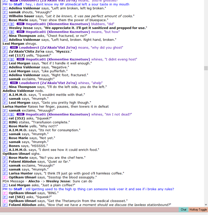 BYOND Key: b5A-bFLm Player Byond Key/Character name: Nina Thompson and Optikam Ulmari Staff involved: Reason for complaint: (State your reason for your complaint) im still new to the whole high RP thing and i love getting called out on my stuff makes a better RP'er and i learn what i can and cant do better, but his instance has left a sour taste in my mouth and im generally easy going Did you attempt to adminhelp the issue at the time? If so, what was the known action taken by administration/moderation? No/and yes , this complaint i seprate but at the time (and the time of this complaint) i am asking an admin to look over the RP to make sure its sound but this is more on rules and what i think is low RP Approximate Date/Time: 07/02/20 1131 So im in game and im quartermaster and then i get injured, a vaurca shaft miner gave me a drink and at the start of the round i felt like i may have insulted him (dont know much about vaurca ooc made sense not to know much) so i took it and drank it, i thought maybe ill get hallucinations idk something funny turns out it was ground up blue space crystal and i teleport into a window at R&D, last time i accept a drink from him then a paramedic named carlos (good guy) takes me to medical then it goes as follows pretty standard stuff he goes out looking for a doctor while im in pain he finds one named nina (yay! im gonna get my fractured foot reset or something idk i don't play medical its a bit too confusing for me, at this point pharma and viro are more my thing cause i can look at the guide without anyone dying ) so nina takes my case,and tells me to follow her, and bring a friend, which if i had been given the option if i knew i was the surgery patient i would have said UM NO you cant be in the room, but the patient gets shafted i think. so we get in the room and i look around at this point vie figured yep its me getting the surgery and my doctors have told me shit all, please see blue circle, she straps me down, i don't get on, she straps me down at this point i'm thinking so not going to explain the surgery to me, or tell me why i need it, and you gonna let your friend be in the room, or give me the option for general anesthetics, so i say 'hold up'...they ignore me to talk about switching the bed on, and she talks on her radio mid surgery prep..... so i ask hey can't i just get general anesthesia i don't need to be knocked out like this and im ignored again and they click on the table i mind i you i type in all caps hold the F on just so they would notice it if chat was a bit hectic still didn't bother holding on. so i'm thinking at this point why player doctor if you aren't going to do any of the doctor stuff, half the fun of rping a doctor is talking to your patient (different game but at least for that was) and they could have, i wasn't in a life threatening situation my foot was fractured some pain meds and maybe a surgery from or some bedside manners could have done the trick before hand surgery lapse but i mean Looc is right below hold the f up she should have seen that .... im not gonna highlight all the points but ill just dump the encounter and jump in at segments lizard assaults me here i think the avoid pain rule applies here as i call for sec and for the ai to let me out but cool whatever good guy sec here, does not bash my head in straight away but probably thinks it looks like a lot of trouble to deal with yes i did.......but if you had asked or listened to me they let me go in the end, at this point i'm really salty and mad, not to mention that there is 5-6 other people in the room when i get out of the surgery block just watching and blocking up doorways stopping me form going anywhere and all i wanted was out and for sec to come get me i get that im new but every round i join i improve and try hard to get into character and roleplay with other people if you check the round log sure maybe my guy is a bit weird but i tried to interact witht he crew. anyways my main complaints are the doctor for low rp no communication, and the lizard guy for attacking me