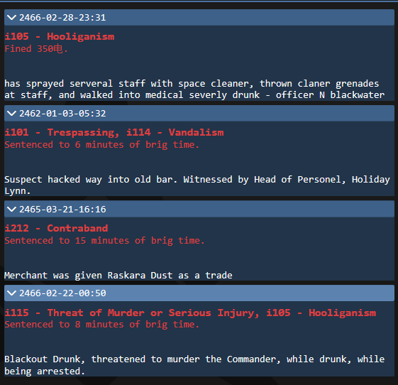 Reporting Personnel: Fa'iq Paruzhulkanich Job Title of Reporting Personnel: NanoTrasen Corporate Liaison Personnel in Question: Mando Forslund Job Title of Personnel in Question: NanoTrasen Janitor Reason for Review: [ x ] - Extended Arrest History [ X ] - Grievous Infraction on Record [ ] - Other: ____(Place an x in the box that applies. If other, replace line and specify.) Notes: Mr. Forslund has quite a few concerning arrests on his record spanning several years, one of which could be considered as drug trafficking. Such history makes this one believe that Mr. Forslund should not be allowed to continue his employment with NanoTrasen. His alcoholic tendencies are also concerning.