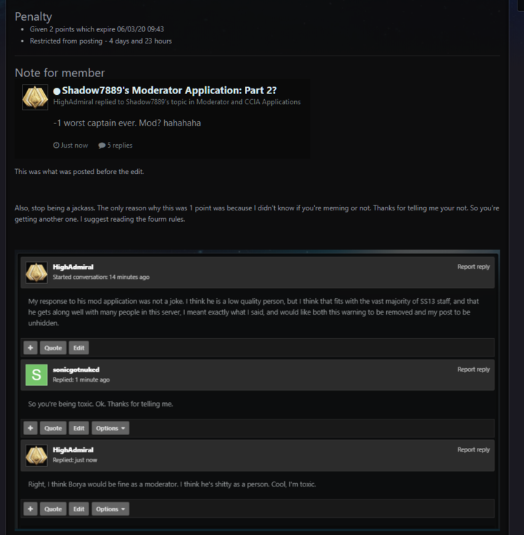 BYOND Key: James View Staff BYOND Key: SonicGotNuked Game ID: Forum related complaint Reason for complaint: Unjust forum ban, silencing my voice on the forum, and presenting incorrect evidence in administrative action. Evidence/logs/etc: - Additional remarks: Sonic warned me for a post I had made on the forum, a single point post marked as "spamming." (picture 1) This was not pointed as toward any specific post, and I had posted on two different moderator applications that day. I had posted a joke response on Shadows application, as he was literally begging for -1s in OOC. I let him see it, then edited to a serious response. I checked his profile and saw he and Borya were friends. I assumed he'd gotten offended by my comment on Boryas applications. The comment was paraphrasing "Borya is a shitty person, probably fits SS13 tho +1" What I should've said, is I personally have had bad experiences with Borya. I think he's a shitter. He is really in with this community though, everyone loves and respects him as he does it. I think he'd be a fine moderator here but not anywhere else. When I contacted Sonic to explain that I wasn't joking or spamming, he sent me one line "Oh so you're just toxic" and added an additional two points, making for a total of three which banned me from the forum. In this second staff action, he posted evidence pointing towards Shadows application which was a clear and obvious joke. I assumed this was a misunderstanding and tried to communicate via discord clarification. He didn't respond either time. I now feel Sonic has maliciously made this a confusing situation, refused clarification on the offending post, and just in general been toxic in retaliation to what he percieved as toxicity. For five days I have been unable to even file a complaint.