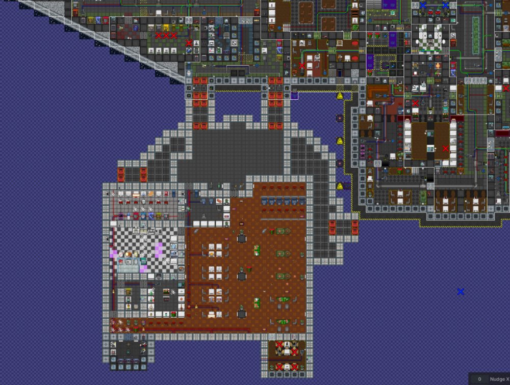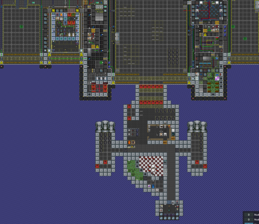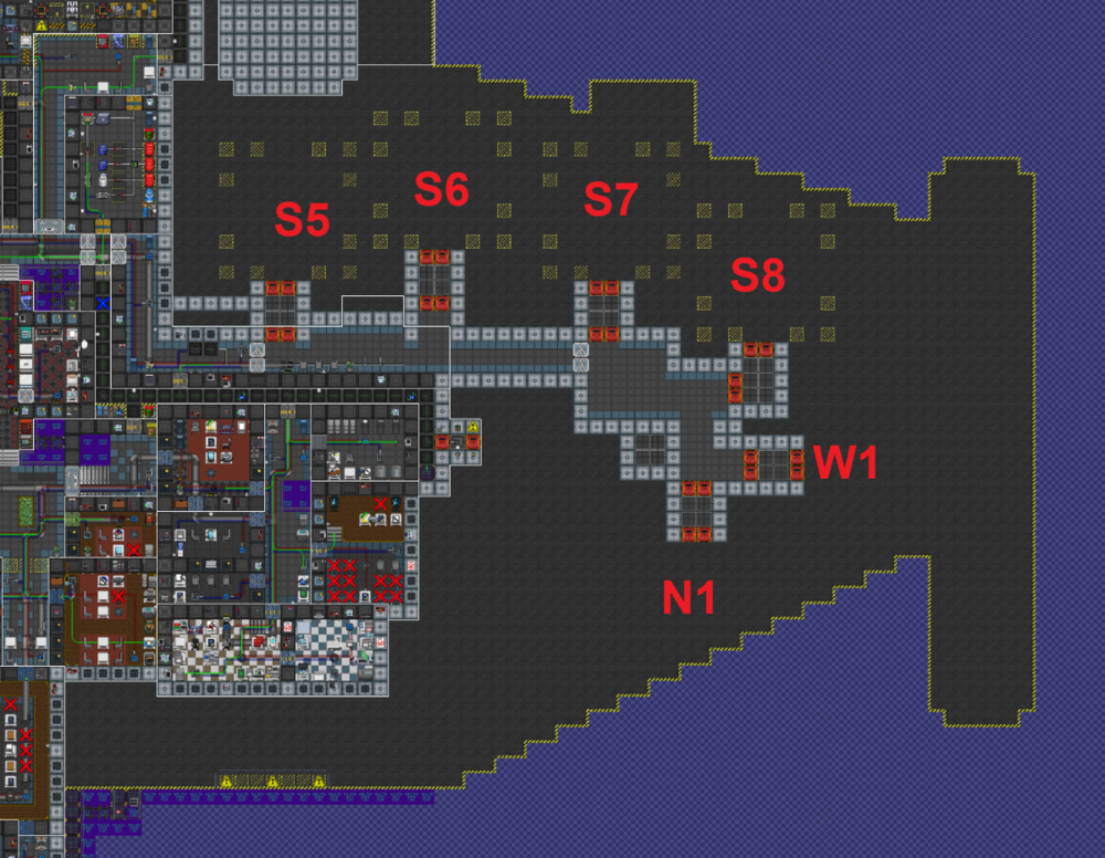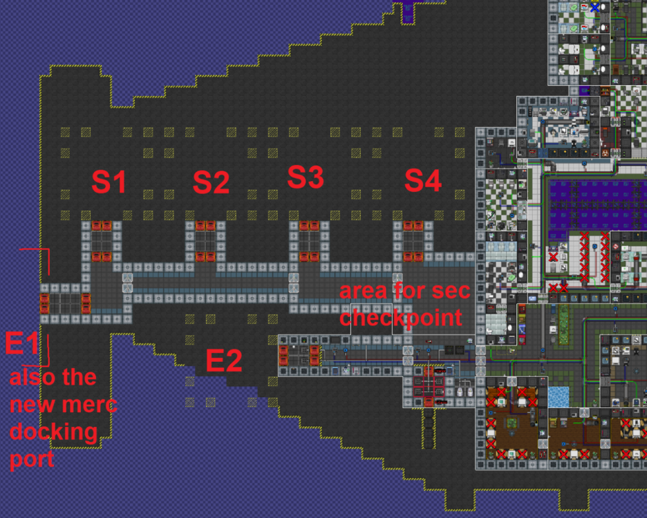 Firstly, standardize the shuttle layouts and sizes. A shuttle should face south, meaning the pilot looks south, and the engines point north. So it is same as the horizon, basically. It should also be 9x9 including walls at most, but could be smaller of course. Secondly, add these docking ports, on the top deck. Either west side ones, or both west and east. Even just on the west side, four standard docks (S1, S2, S3, S4) is more than enough (if somehow were to have 3 away site/ship shuttles coming in + merchant or something). With also E1 for the merc (if they were not remapped to the new standard). And E2 for, uhh, something I guess. That should be enough, but more is always good, for variety and stuff. There's also enough space for security checkpoints, on both east and west sides.