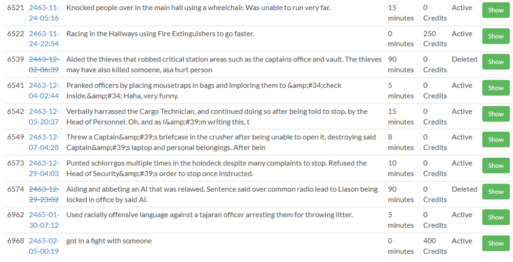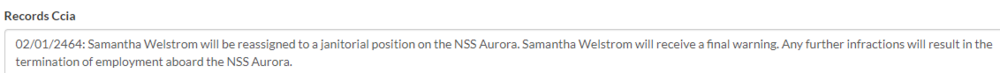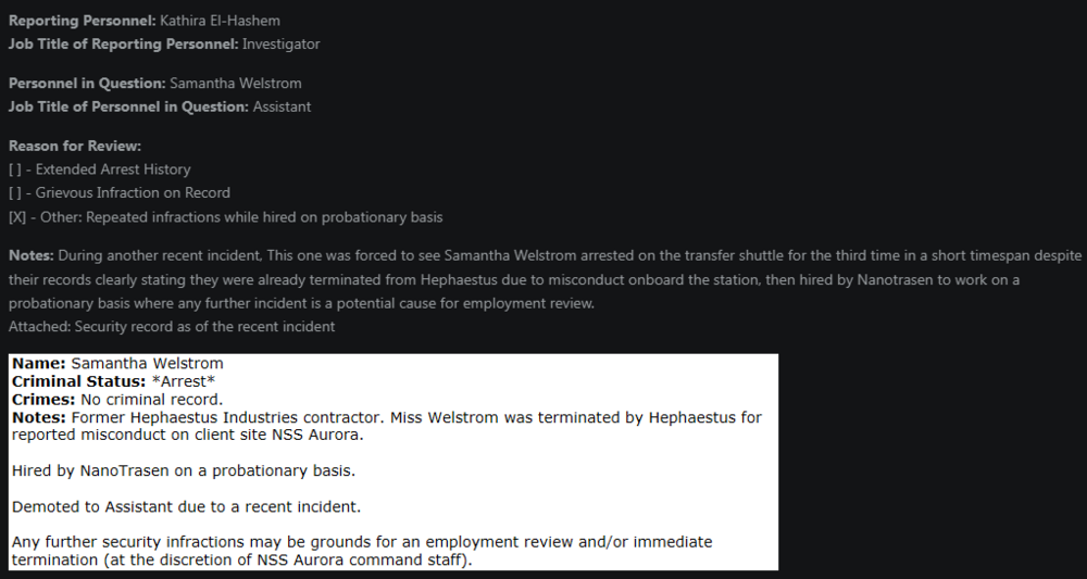 I want to preface my response with the assurance to anyone reading this that terminations are not handed out lightly - they are, at their most essential, a character-ending decision. Terminations are considered a last resort by CCIA personnel, and are only utilized when an offense is so grievous that any other punishment would not suffice, or when a character has exhausted the good will of their parent company and by the extension the SCC. That being said, I stand by my decision to terminate Samantha Welstrom, and I will tell you why. Between the end of 2643 and the early months of 2465 Samantha accrued 8 canonical charges (those striked out are from antag rounds and thus non-canon) of various degrees of severity, from petty hooliganism to acts of intended malice. Six of these eight charges were accrued in less than two months time, which prompted a Review Request by another character, Kathira El-Hashem: The information detailed in their record as well as their extensive violation history in a brief period prompted CCIA at the time to permanently reassign Samantha to Janitor on January 2nd, 2022. This change can be seen in their history of rounds, as detailed in the WI: Samantha was then present for the remainder of January as a Janitor without issue, and then their activity broke apart into long spurts of inactivity until January of this year: No formal appeal to be reinstated as Shaft Miner was documented at this time, as far as I can see in our archives. By and large this flew under the radar until the most recent Incident Report in which Samantha was named as the offender: We can see here that not only was Samantha charged for this behavior (though was deemed inadequate by the reporter of the IR, thus leading to its report), but she also was charged for i103 - Minor Assault only a few days later. Samantha's prior CCIA note regarding her reassignment to Janitor mentions that "any further infractions will result in the termination of employment aboard the NSS Aurora". One might be tempted to retort with the technicality of the note only mentioning the NSS Aurora and not the SCCV Horizon, but ultimately this has little ground given that we had moved to the Horizon map only three months later from the date of the reassignment and Samantha was largely inactive for the remainder of 2022/2464. "Most real places of employment will waive past offenses after a certain amount of time has elapses when considering new offenses. Given that a year passed in between I do not believe the incident in question on it's own was severe enough to warrant outright termination." While this may be the case for 'most real places of employment', the reality that Samantha was more or less absent for the majority of the year and returned to regular employment only to be wrapped up in an Incident Report and accrue two charges in less than a week tells me that there's very little to consider about whether or not Samantha had actually changed her behavior and was ready to join the Horizon crew as a productive staffer. A statute of limitations on consideration of offenses does not work when a player can simply sit out for months at a time until they fall out of public view - it creates an unfair environment for characters who follow regulations and are regularly present on the ship. If a character can accrue a number of charges and simply go inactive to allow them to fall off it opens the door to bad behavior without due recompense. For the reasons I've detailed here and for the sake of preventing patterns of behavior like this in the future I decided to terminate Samantha Welstrom.