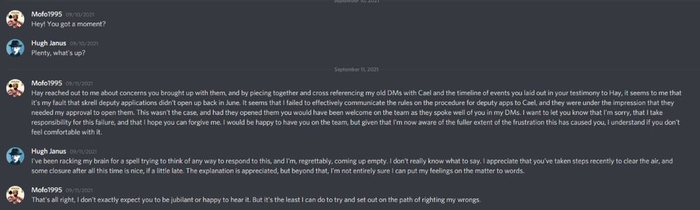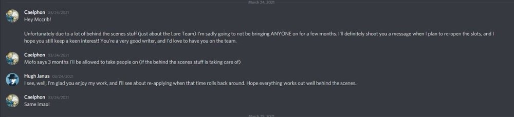 BYOND Key: MccRrib Staff BYOND Key: Caelphon/Mofo1995 Game ID: N/A Reason for complaint: I'd like to say as a preface that this complaint isn't intended to contest the lore team's choice of developer, Styx is a talented writer, and I think they'll do a great job with skrell lore. That being said, I'm more than a little dissatisfied with the reasons provided for my denial, and with the conduct of our two loremasters in regards to both of my lore team applications. I'm going to start by addressing my deputy application from February of this year. During the months leading up to the unexplained closing of the deputy slot, I wrote and workshopped several pieces of lore, not just when requested for my app but also in DMs with Cael. One particular piece I was told would be sent for review to the human lore team following some editing and review from Cael and the rest of the skrell team at the time. (1) I received no updates from Cael regarding it and a later conversation with a member of the human lore team informed me that, from what they remembered, it was never shown to the human team. As far as I know, that piece, along with the others I wrote, never left our DMs. Following the closing of my deputy application over unexplained "behind the scenes stuff," I was told to wait three months before having another go at the slot. (2) Those three months came and went without a word of elaboration from Mofo or Cael, and in contrast to what I was told in DMs, the slot was never re-opened and that chance to have another go at applying for skrell deputy never came. I was offered no further information on the subject until earlier this month, a whopping seven months after my initial deputy application, when I was contacted by Mofo with the following. (4) Understanding of how two writers working in conjunction managed to go three months without clearing up what was a simple communication error is beyond me. However, frustration remains within reach given that a major reason for my denial, as cited by both Cael and Mofo, was a lack of lore written and put to the forums. I can't help but wonder whether or not a lack of lore written would have been such a big issue had what I wrote left my DMs with Cael at any point or if my prior attempts at seeking a lore writing position hadn't been stymied over a communications error. I feel as if my application(s) were egregiously mishandled, and that the conduct of both parties warrants investigation. Evidence/logs/etc: (1): (2): (3): (4): Additional remarks: N/A