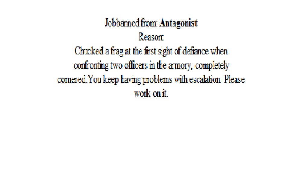 I will revise the CE selection after reviewing it further. However some events from the round were out of my control. Reading the Gadpathur section again changed my mind about why I would select them. I would like to draft another character for that role based off your advice here. They would be some sort of human. As for the administrative actions/notes. I cannot go back and pretend what I did will magically go away but rather learn from the mistakes and fix the issues. After returning to server after seven month break I played for two weeks before even considering to appeal for the antagonist ban. My recent interaction with the community has made me want to do more. I'm currently in the process of learning how to use the code as well as spriting items. I wish to contribute more than I have in the past. Addressing my previous issues from February I finally went back and sought out professional help with my issues irl. It weighed on every aspect of my life and it reflected out in my ss13 experience as well. I've been attempting to correct my past mistakes irl and online to show everyone that i'm better then what I did before hand. I'd rather not burn the bridges with everything. I enjoy being around this community and would like to involve myself more.
