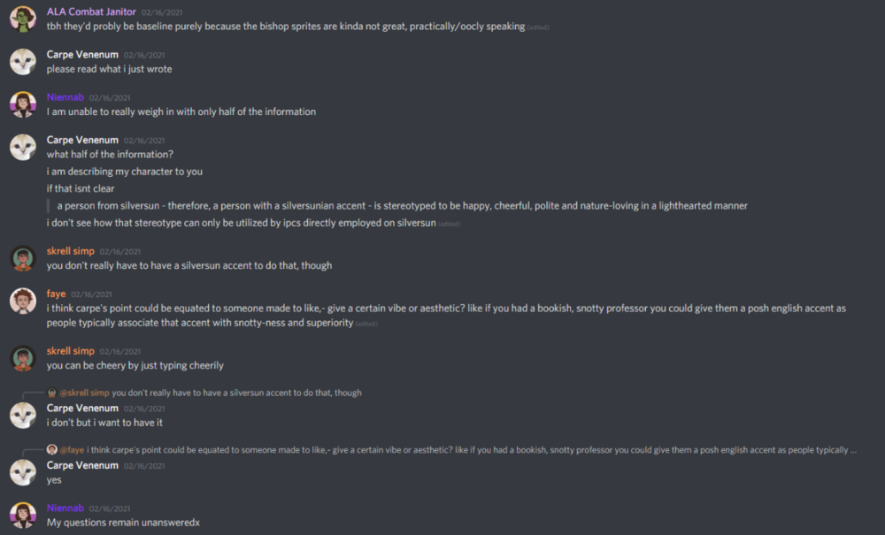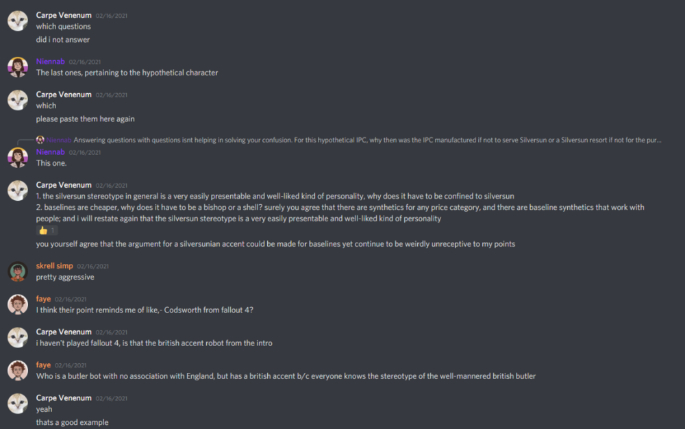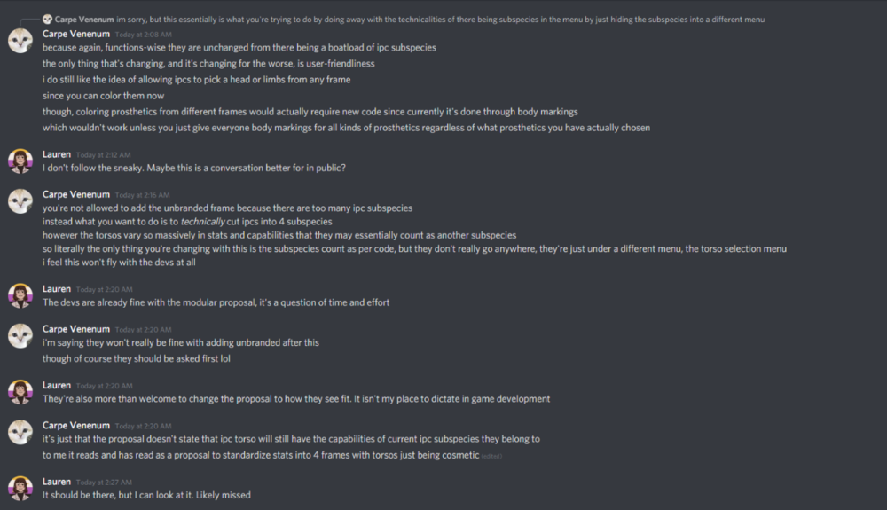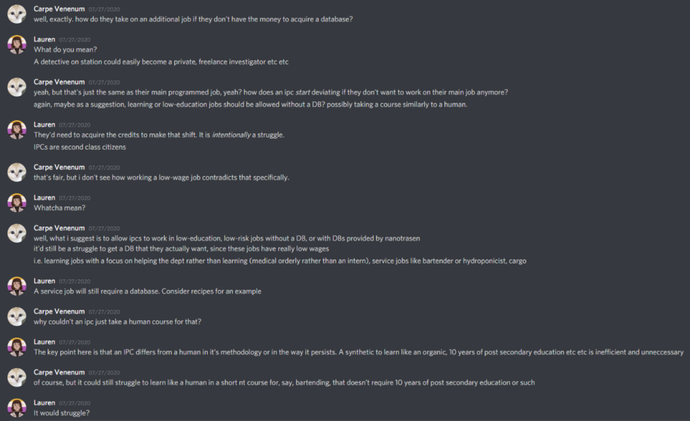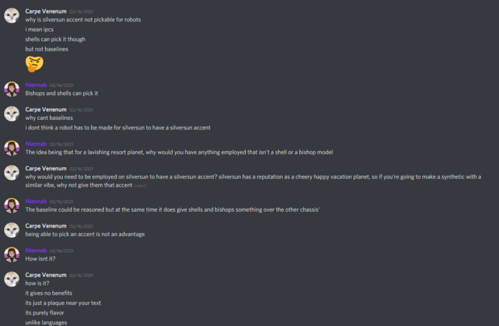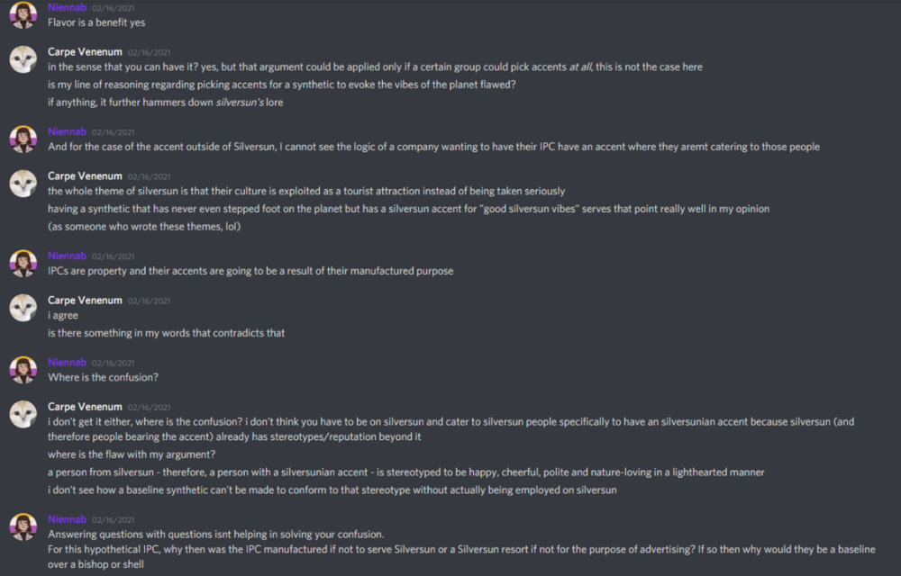 6. BYOND Key: Carpe Venenum Staff BYOND Key: NiennaB Game ID: Not applicable Reason for complaint: Continued extremely stubborn behavior and refusal to answer questions or suggestions in a meaningful manner. I don't find this acceptable for a loredev of a race that is supposed to be one of the more open-ended ones, encompassing a concept as broad as "megacorp-made bipedal sentient robot." As well as an attempt to harass me via a player complaint over a personal issue. Evidence/logs/etc: I want to preface this by saying that my behavior is absolutely not perfect, as stated both by NiennaB in her player complaint against me, by feedback on my Skrell deputy application, and many others both since my return to the server and before in general. This staff complaint is not me trying to somehow absolve myself of all wrongdoings. However, my behavior against Nienna specifically is not completely unfounded, and while - again - it is wrong for me to behave this way, my patience is very thin when it comes to interacting with them. February 16th I came on the Synth lore discord channel to inquire why Baseline IPCs can't pick the Silversun accent. I have attempted to state my point several times over and over, however Nienna has refused to really acknowledge any of my arguments earnestly and repeatedly continued making points that I have already refuted. I have gotten rude in that conversation, yes, but I don't know how one wouldn't get rude after answering the same questions, over and over again, to the same person, in different phrasings, in the same conversation. During this conversation, and after it, I have got DMs from other players (whom I will not name) saying that they do understand what I'm saying and think that Nienna is being overly stubborn. Nienna is also referring to some "confusion" that I have about the IPC lore where there really isn't any - I have expressed my point, in my opinion, very clearly. This is not the first time Nienna was just talking down to me. July 27th I went to Nienna's DMs to ask a few questions about the IPC lore and education. Throughout our conversation, Nienna was very dismissive to my points and talking down to me like I am a new player, which I do not find friendly at all, which loredevs are supposed to be. The areas which we have discussed have since never been expanded upon on the wiki, or in IPC lore, which I find symptomatic of a larger issue with IPC lore - a lot of info on how characters should be made hinges on arbitrary decisions that are made in DMs and change from loredev to loredev, or even what loredev you ask in a particular dev team (which is also reflected in this conversation). I have honestly went away from that conversation very drained. Not only did I not really get any help with creating a backstory for my character, instead just getting the list of arbitrary restrictions of Nienna, I felt like, again, I was talked down to - as if I haven't read the rules and didn't know what jobhopping was. My response to it was very snippy because I do not appreciate that tone at all. Since then, despite promises that databases would be outlined on the wiki, a search for the term on the wiki brings up no results relevant to IPC lore, again exacerbating the issue of IPC lore being decided in DMs with loredevs. March 1st I have went to Nienna's DMs to offer to code a new feature for the IPC lore. I went specifically to DMs because I did not want my words treated by the wider community as a promise, since I am not a part of the dev team and it would be my first large coding project for Aurora. We disagreed about the implementation. The same pattern repeats - I disagree with Nienna and make my point in perhaps a less respectful tone than I ideally could. I immediately apologized for my harsh tone. Nienna continues to ask me the same questions over and over again without making any counterarguments to what I just said despite me, in my opinion, laying out my point very clearly. They point out a mistake I made, which I accept, and then proceeds to block me for "talking to them with attitude". I pointed features I liked about the proposal and I pointed the features I did not like about the proposal with explanations why, but all I got is just "the devs didn't object to it" and "I don't follow", followed by getting blocked, without any actual discussion. This kind of attitude makes me neither want to contribute to IPC lore, nor really play the species. I study AI systems in real life and I absolutely love playing synthetic characters outside Aurora - but this behavior from loredevs, with arbitrary restrictions that can change at any moment and cannot be budged at all, make me seriously question whether it's worth it to play them here. I have talked to other players and I am not the only person who thinks this way. Nienna then proceeded to make a player complaint on me. What they omitted from the player complaint is that in all of the cases they brought up, I have apologized, in some cases repeatedly, to the people I was being rude to, including Nienna themselves. The apology has been accepted by them as well, but they proceeded to make a public player complaint. Originally, I intended to make this complaint in private to Mofo, but Nienna brought it all into public, which I can only interpret as an attempt to have the public bash on me, like in all complaints of the "don't be a dick" nature.