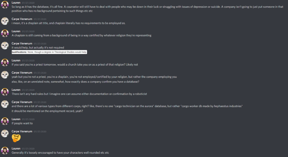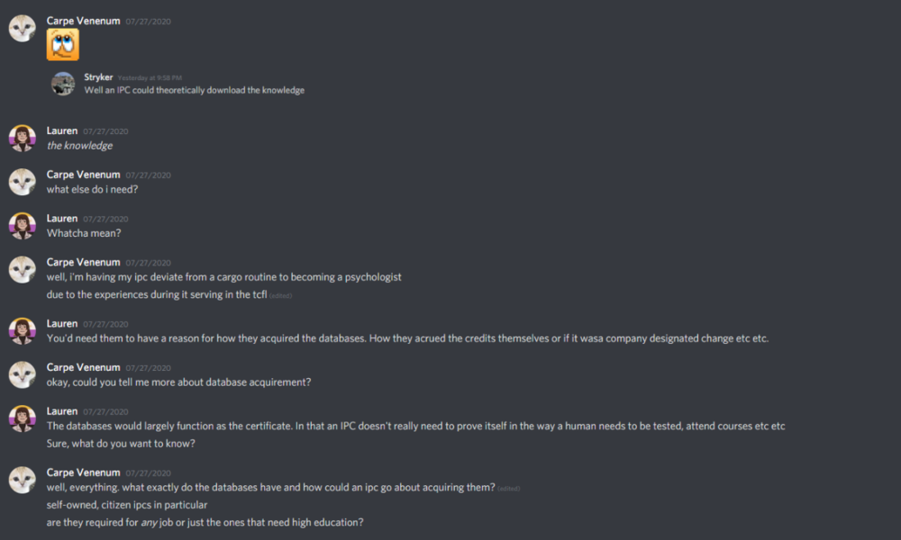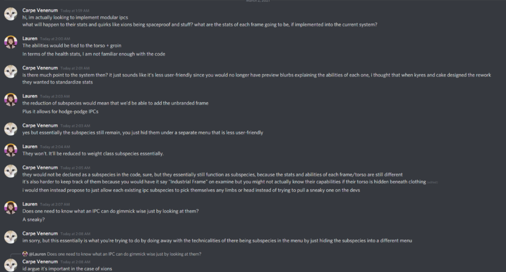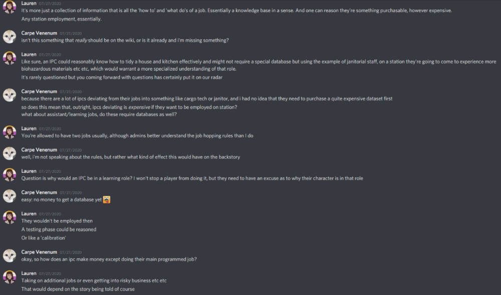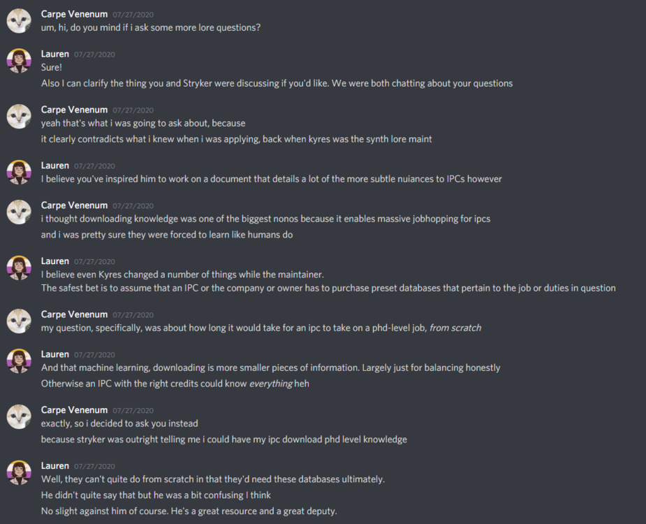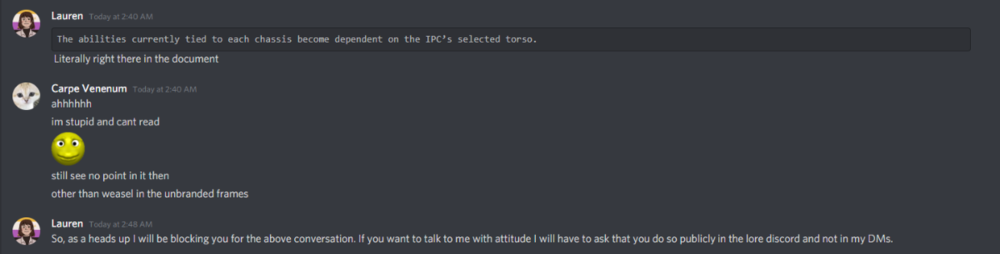 6. BYOND Key: Carpe Venenum Staff BYOND Key: NiennaB Game ID: Not applicable Reason for complaint: Continued extremely stubborn behavior and refusal to answer questions or suggestions in a meaningful manner. I don't find this acceptable for a loredev of a race that is supposed to be one of the more open-ended ones, encompassing a concept as broad as "megacorp-made bipedal sentient robot." As well as an attempt to harass me via a player complaint over a personal issue. Evidence/logs/etc: I want to preface this by saying that my behavior is absolutely not perfect, as stated both by NiennaB in her player complaint against me, by feedback on my Skrell deputy application, and many others both since my return to the server and before in general. This staff complaint is not me trying to somehow absolve myself of all wrongdoings. However, my behavior against Nienna specifically is not completely unfounded, and while - again - it is wrong for me to behave this way, my patience is very thin when it comes to interacting with them. February 16th I came on the Synth lore discord channel to inquire why Baseline IPCs can't pick the Silversun accent. I have attempted to state my point several times over and over, however Nienna has refused to really acknowledge any of my arguments earnestly and repeatedly continued making points that I have already refuted. I have gotten rude in that conversation, yes, but I don't know how one wouldn't get rude after answering the same questions, over and over again, to the same person, in different phrasings, in the same conversation. During this conversation, and after it, I have got DMs from other players (whom I will not name) saying that they do understand what I'm saying and think that Nienna is being overly stubborn. Nienna is also referring to some "confusion" that I have about the IPC lore where there really isn't any - I have expressed my point, in my opinion, very clearly. This is not the first time Nienna was just talking down to me. July 27th I went to Nienna's DMs to ask a few questions about the IPC lore and education. Throughout our conversation, Nienna was very dismissive to my points and talking down to me like I am a new player, which I do not find friendly at all, which loredevs are supposed to be. The areas which we have discussed have since never been expanded upon on the wiki, or in IPC lore, which I find symptomatic of a larger issue with IPC lore - a lot of info on how characters should be made hinges on arbitrary decisions that are made in DMs and change from loredev to loredev, or even what loredev you ask in a particular dev team (which is also reflected in this conversation). I have honestly went away from that conversation very drained. Not only did I not really get any help with creating a backstory for my character, instead just getting the list of arbitrary restrictions of Nienna, I felt like, again, I was talked down to - as if I haven't read the rules and didn't know what jobhopping was. My response to it was very snippy because I do not appreciate that tone at all. Since then, despite promises that databases would be outlined on the wiki, a search for the term on the wiki brings up no results relevant to IPC lore, again exacerbating the issue of IPC lore being decided in DMs with loredevs. March 1st I have went to Nienna's DMs to offer to code a new feature for the IPC lore. I went specifically to DMs because I did not want my words treated by the wider community as a promise, since I am not a part of the dev team and it would be my first large coding project for Aurora. We disagreed about the implementation. The same pattern repeats - I disagree with Nienna and make my point in perhaps a less respectful tone than I ideally could. I immediately apologized for my harsh tone. Nienna continues to ask me the same questions over and over again without making any counterarguments to what I just said despite me, in my opinion, laying out my point very clearly. They point out a mistake I made, which I accept, and then proceeds to block me for "talking to them with attitude". I pointed features I liked about the proposal and I pointed the features I did not like about the proposal with explanations why, but all I got is just "the devs didn't object to it" and "I don't follow", followed by getting blocked, without any actual discussion. This kind of attitude makes me neither want to contribute to IPC lore, nor really play the species. I study AI systems in real life and I absolutely love playing synthetic characters outside Aurora - but this behavior from loredevs, with arbitrary restrictions that can change at any moment and cannot be budged at all, make me seriously question whether it's worth it to play them here. I have talked to other players and I am not the only person who thinks this way. Nienna then proceeded to make a player complaint on me. What they omitted from the player complaint is that in all of the cases they brought up, I have apologized, in some cases repeatedly, to the people I was being rude to, including Nienna themselves. The apology has been accepted by them as well, but they proceeded to make a public player complaint. Originally, I intended to make this complaint in private to Mofo, but Nienna brought it all into public, which I can only interpret as an attempt to have the public bash on me, like in all complaints of the "don't be a dick" nature.