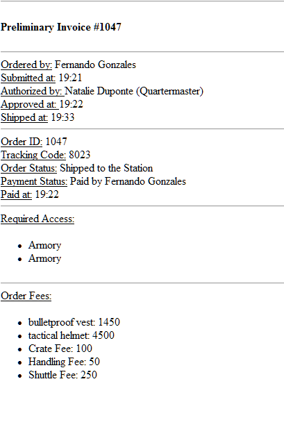 Reporting Personnel: Anna Clifford Job Title of Reporting Personnel: Head of Personnel Game ID: b4R-c8wM Personnel Involved: - Fernando Gonzales - Chief Medical Officer: Offender - Anna Clifford - Head of Personnel: Witness - Khaled Al-Bastaki - Head of Security: Witness Secondary Witnesses: - Natalie Duponte - Quartermaster: Witnessed Gonzales ordering the mentioned order and asissted in collecting cargo records for investigation - Valorallen Vitellia - Captain: Briefly looked into the matter before declaring it a misunderstanding Time of Incident: 19:22 Real Time: Approx 21:00 GMT 24/12/2019 Location of Incident: NSS Aurora Nature of Incident: [ ] - Workplace Hazard [ ] - Accident/Injury [ ] - Destruction of Property [ ] - Neglect of Duty [ ] - Harassment [ ] - Assault [X] - Misconduct [ ] - Other _____ Overview of the Incident: The long and short of the matter is as follows; At approximately 19:22 Fernando Gonzales withdrew 3000 credits from the Station Medical Account, something that I found out after noticing he had previous CCIA reports about him inappropriately spending departmental funds. Following further investigation and hearing from Natalie Duponte, the Quarter Master, I learnt he had purchased an order containing a ballistic vest and helmet as a 'gift' for someone, for whom I am unsure. After inquiring with Duponte further, she handed over records indicating that the total cost for the order was 6,350 credits. I then looked into Fernando's account and the medical account after discovering he started the shift with 5,616 credits in his personal account, notably less than required for the 'gift', and saw he had deposited three thousand thalers, from the medical account into his own, bringing his total up to 8,616 credits. He then spent the required amount on the Cargo order and proceeded to spend a further 120 credits on snacks from a vending machine. At this time I suspected Gonzales of embezzling funds from the Medical Account for his own gain and immediately reported the matter to the Captain Vitellia. I met with him and explained the matter to him, and he would see to the matter, he later called Gonzales to his office and presumably discussed the matter, for some time. Before I received a PDA message to the effect of it being a misunderstanding and that the purchase was a gift for medical and the matter was resolved. I saw the purchase of a ballistic vest for medical unneeded and inappropriate but I let the matter slide until Gonzales announced he had repaid the outstanding balance to the medical department, which was three thousand credits that he initially took. However, due to the purchases, he was only able to pay back 2146, leaving the medical account 854 credits short, meaning he has in effect stolen money. By this time the captain had left for the shift and I was concerned with their own findings, either they had missed the eight hundred credit shortfall or were willing to overlook it, regardless, that is outside the scope of this complaint. Given this, I raised the issue with the Head of Security Khaled Al-Bastaki, and he reviewed the evidence I had collected (see additional notes) and concluded that if I was right, it was more resembling fraud than theft, however I am not a forensic accountant, he also recommended I make this complaint formally to CCIA given my own personal involvement with the matter and that the captain declared the matter 'put to rest' as well, to recuse ourselves from it. I feel this issue is highly important as Gonzales has been reprimanded for inappropriate use of station funds before and to make the same offence again shows complete disregard for rules and the way we do things at Nanotrasen. Did you report it to a Head of Department or IAA? If so, who?: Yes, Captain Valorallen Vitellia and Head of Security Khaled Al-Bastaki Actions taken: Internal Investigation and collecting of evidence by myself and reporting to two heads of staff before reporting the issue here. Additional Notes: Please find attached the transaction logs for Gonazales' Account and the Medical Account as well as the order made by Gonzales for the ballistics armour.