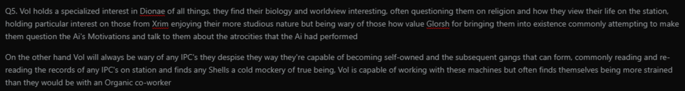 Q1. There are numerous themes that permeate the Skrell but perhaps the most obvious is their psionics, this influences everything, from the way the interact with one another to the wake causing a schism within their species due to the differences between Listeners and Receivers that doesn't take the form of outright violence but instead in rebellions such as self-isolation or counterculture against the Federation's "Norm", their long age combined with their long memories meaning that Skrell and their descendants can fall victim to long-running political games with many young Skrell in the Federation trying to make their way could fall victim to age-old rivalries that could have been born from somthing as petty like because one of their ancestors may have copied the research of someone in a far higher position now, and their longer lives mean that their education, entertainment and even worries takes longer to be considered more "Worthwhile" with Skrell often not worrying about being socially rejected viewing it as something "Minor" but viewing existential threats as a major threat they may have to contend with, they also have a higher resistance to accumulating stress but once they get into a stressed state it becomes harder to relieve with many taking a year or two to take time off in relative isolation, and finally due to their longer lives and therefore longer education Skrell usually have more of a scholarly side, with their universities being some of the hardest to remain within such as the Gliutip’lyaz which excludes those who score below 70% on a applied knowledge exam or any other graded activity, meaning most tend to work within Medical or Science Departments on the Aurora Q2. To a Degree, yes, Vol has been heavily influenced by the teachings of their far older Caretaker in the Supernova Era not long after Glorsh has caused them to have this undeniable wish to protect the Federation and the people in it, hearing stories of Marauders and Rebellious individuals has moulded them and they've become concerned that these people might be leaving Skrell space to foster rebellion and other forms of dissent, and they worry about the rational law-abiding Skrell falling off the "Right Path" and this worries Vol, and while they may not be following the traditionally more intellectual path of the common Skrell, they view their job with a far more cerebral edge and use the same focus other Skrell would use when studying or doing Lab Work /creating Art rather than just brute strength which I think would be incredibly interesting to RP and work with the other members of the ISD, and their receiver tendencies still show even in this job, Vol far prefers to run their plans past the rest of the ISD rather than just acting by themselves and is prone to agreeing with the way command is handling the situation unless they see it as objectively awful and the rest of the ISD members are also against it. Q3.Alot of the reason I like Skrell are the same reasons I mentioned above about their core themes, I think the Psionics will be incredibly interesting to work with in an RP environment, how people may distrust my character as a result will be quite fun to experiment with, Also I believe there's a market for Skrell, there are a few in Medical, a couple in Research and I think a handful of Command members but there is a vacancy when it comes to Security and when the effort has been made to make a Federation Enforcement page, I think it wouldn't be too out of left field for one of their forces to end up on the Aurora especially after finding a terrorist cell on there with the events of Warbling: the Musical, and give a little bit of Jargon influence within it, which should be pretty fun. Q4. Due to their education it was pretty difficult to come up with a backstory that didn't lead to a Science or Medical member, and that remained internally consistent and relevant. But that's about it really. -