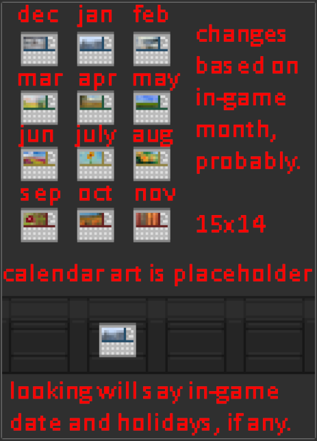 Drab, unadorned bulkhead got you feeling down? Wish there was more on the wall to stare at than air alarms, light fixtures, and your Dominian co-worker's portraiture of a questionably real deity? Well, buddy, have I got something for you! You know what's a staple of corporate offices everywhere? Calendars. Miranda really spared every expense shipping these to the Horizon. They're cheap! They're flimsy! You have a PDA, anyways! But hey. They're there. I don't really know how to code at all but here are some sprites in case someone reading this does. To briefly explain my Vision™ in how these would "work," the complexity of which I am uncertain... looking at them tells you the current in-game month, day, and year. It will also, hopefully, tell you if there are any holidays occurring, whether that be Christmas, Hanukkah, Republic Day, or really, any of the holidays that I swear the game tells you about at round start. Wow! The tiny, like 10x5 pixel "art" on them is a placeholder and should be replaced, eventually, because it's just resized stock images. Kind of lazy, I know. I don't really know how to code, so I'm just dropping these here if any coder is interested in further cluttering the Horizon's walls. Here's the .dmi: calendar.dmi