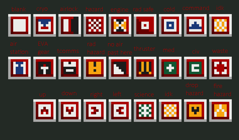 The case I'd make for these is that they're fairly compact (9x9 pixels, making them, I think, much smaller than certain signs, which are much larger) but yeah --- the semiotic standard stuff I based them on is both a) abstract and b) in some cases, does not translate well or at all. The case I'd make for them is that they look cool and futuristic and also visually English signage in a universe where English is ostensibly no longer a widely spoken language makes my head hurt.