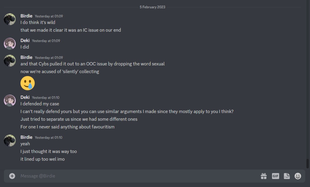 I have never accused or alleged anyone of favoritism or bias on the basis of their friendships. Sveta's comment in the Relay about "What will a Relay mod do, tell us to go to the Lounge?" Which is the only thing that I've done that might be misinterpreted as an accusation like that comes from an actual case where a Relay mod subtly urged crew disliking Relay conversation into the Lounge. Given my above reply, I don't think I can respond to this, since it has nothing to do with me. If you think it does, my response might cover what you think below. I can't even say "I'm offended" as I'm too sick of this situation to be so. What I will do is break this down. Firstly: When have I contradicted myself? Please provide evidence when you accuse me of something. I have not gaslighted anyone, the only thing I've done is explain my intents with my IC action and why I think it's frankly bullshit that Svetas conduct results in action taken against me as a player, when I have violated no server rules and have not done with Cybs claimed I did wrong. I have not accused anyone of sexual harassment, nor have I forced a conversation on that subject. Second: Please stop assuming what I'm feeling. I am not commenting on Pwners complaint, nor am I confirming or denying my opinion on it. Do not drag me into that accusation. Third: While Pwner and I did communicate when you muted both of us, that was only because you were busy and took an hour to reply, we were confused and trying to piece together what you meant. Since then we have had ONE exchange, which I will actually screenshot and show you. I would hardly call that a "joint effort" to attack Goolies, someone who I have never interacted with. Someone who I do not care about. Someone who is barely even related to the original staff complaint, if at all. Before you reply to this explaining that our screenshots of Kealas behavior were an attack on Goolies, please read my above posts where I explicitly explained and expressed why they are not that. (I only say this because this exact thing has already happened.) I'll leave this one with this: I have no motives against Goolies or against Cybs. Frankly I'm just very frustrated and these two complaints are stressing me out. I have other things I should be doing with my time, including my actual real life. My goal in defending myself is to have my strike removed, that's it. I'm not aiming for any punishments, or anything of that sort. I also do not speak for Pwner in any capacity, I'm actually upset that I'm even involved at all, since Cybs seems to primarily have issue with Pwner and their accusation of favoritism. I've explained why I have not done anything wrong, unless someone quotes me and blatantly misidentifies something I've said, I have other things to do. This will be my last reply on the player complaint until a verdict. I pre-emptively apologize for how rude this comes across as, I am very tired of this.
