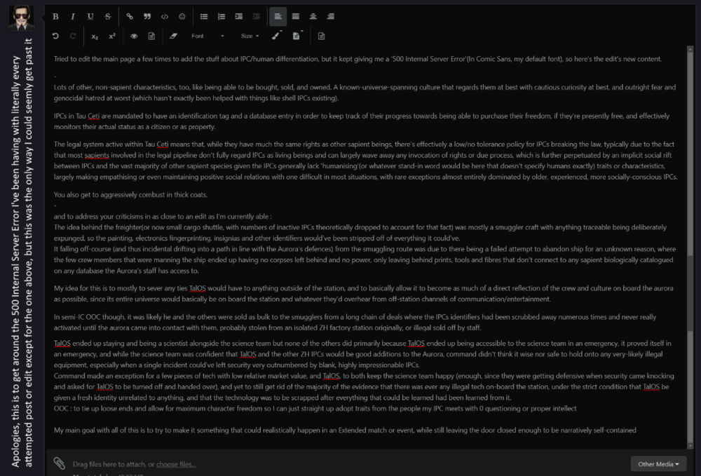 An extreme example, yes, but that was a theoretical one that I'm using to demonstrate the learning style I'm going for with the character (while avoiding going into a multi-page essay on pure neural networking), not the character's actions in and of themselves, or what they may end up doing. It's why I articulated that they'd already have a baseline of experience after I gave the example, not before, since the latter would contract the former outside that context. IC the basics would already fully need to be understood in order for security to have ever accepted the idea of keeping it active on the station for longer than they necessarily needed it to be, and him being patiently taught some of the do's and don'ts of social situations bit by bit by the science department in the past while performing otherwise mundane tasks a lot more rapidly and unquestioningly than his biological superiors without becoming bored or unfocused (ZengHu's being a high speed, high dexterity frame able to carry out fine detail motions at exceeding speed without fault, making him perfect for things like mass fabricating components for the science team who's actually doing the interesting tests and research) would give the character a good ic reason to view the science team as close to a family as the character would be capable of understanding it, and also give a good ic basis for deferring to his actual superiors for knowledge and instructions instead of consulting the station hobo with a gun for what he should do next OOC I know what he does can't cross the implicit golden rule of 'don't be a party pooper and put people in actual or theoretical danger as crew, including yourself', so it'll be restricted to things like repeating memorable things that other characters said to others in loose-fitting contexts, repeating actions he's recently seen other people do and such. I've no intention of using this character to exploit any loopholes or rule lawyer anyone, especially when one of the main reasons I've set aurorastation as the only SS13 server I play on now is because of the nice, fun and non-confrontational community that seems pretty much exclusive to the server, and I wouldn't want to contribute to any loss of community quality or ruin anyone's experience The character's overall intellect will be more comparable to some forms of high functioning autism in teenage/very early adulthood years. Grasping large, abstract theoretical concepts with ease and coming up with purely logic-driven solutions that seem alien to everyone else, but being largely tone deaf to social situations while still being able to avoid properly bad situations(IC that other crew have had to put with in the past and politely ask him to not shout at the security staff, sit him down, and kindly explain to him why you don't talk to the chief of security over a document that was already in transit to the science department in the same way the chief of security talks to someone suspicious about showing their identification. OOC situations that come near rulebreaking or failing the self preservation check, or generally being an ass, and situations where this is a possibility will be dismissed by the character recalling something like a past event where he tried something similar and didn't get the intended result) You make a good point with the database thing, too, since that'd also likely include social, cultural, religious and psychological studies, too. Not just how to put together medical brews or how to build complex scientific machinery. An additional layer I could add to the character's personality would be the cold interpretation of those facts, but without drawing much of the social lessons humans or other sapient species would if given the same facts, largely missing correlations and connections where they'd otherwise exist to the more socially competent IPC, where his reasons for doing things socially sound more like a research paper than an explanation. That, and the main thing I also want to accomplish with the character's learning style is directly having them learn the universe from the people on the station and to be moulded in the image of what he experiences with little reservation beyond things either being illogical, directly or indirectly leading to his own termination, or impeding his ability to perform his duties as a scientist -