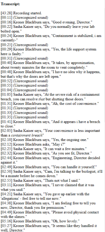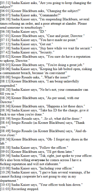 Reporting Personnel: Sasha Kaiser Job Title of Reporting Personnel: Research Director Game ID: cuD-aisg + the round prior Personnel Involved: Kroner Blackburn, Xenobiologist - Offender Sasha Kaiser, Research Director - Witness Samdarr Kii'jri, Head of Security - Witness Secondary Witnesses: Cam Mueller, Chief Engineer - Pulled the comms logs The security team of the shift - arrested and presumably spoke to Blackburn Time of Incident: ~23:40 2466-7-9 Real Time: ~6:40 PM MTN Location of Incident: Xenobiology/Science/Comms Nature of Incident: [ x ] - Workplace Hazard [ ] - Accident/Injury [ ] - Destruction of Property [ x ] - Neglect of Duty [ x ] - Harassment [ ] - Assault [ ] - Misconduct [ ] - Other _____ (Place an x in the box that applies. If other, replace line and specify.) Overview of the Incident: The two events are spread between two shifts, prior to these shifts I've have had issues with Doctor Blackburn refusing to take on a project, citing that he is "just here to maintain the slimes." As his Director, I told him that this was not good enough and that I expected him to come up with a project. To this date, he has not made progress towards this request. During the first shift, on 09/07/2466 around 23:00, Kroner Blackburn arrived on deck. I told him I was surprised he was still employed, leading into a conversation where he asked if I had "beaten my allegations." I asked for him to elaborate several times, both over comms and in person, and was given no explanation. I asked him for his project of the day, and given no response. I decided to talk to him in person and walked to his lab, I saw the doors were bolted open all the way into the communal lab. He was questioned on this, and told me it was for his "convenience." Kroner attempted to leave to respond to a station announcement re: a slime leak. He was told he could wait a minute, and in retaliation he got on comms and said that I had "decided he couldn't help" and that "engineering could deal with it themselves" - a complete lie, which he then denied to my face. I decided to have him suspended for the shift and security was called to take him away. During the second shift, on 09/10/2466 around 1:00, I arrived on deck. I asked for a check in and was met by an insistence that his suspension was revoked. I did not want to argue with him and told him to drop the attitude several times, with the threat that if he could not, he would be suspended. His attitude did not stop, going so far as to antagonize me. He was suspended for the shift with the insistence that "IA would hear about this," to which I informed him he was correct. These incidents showcase an employee who is not only non-productive for the SCC in his complete refusal to conduct actual research, but a hazard to others in his blatant disregard of containment procedure. His assertion over my "allegations" leads to the suspicion he has intentionally been poisoning the well within my department or otherwise by spreading rumors, speculation founded on his belligerence towards myself. He has been given countless warnings with no improvement, leading to this esclation. Submitted Evidence: Comms logs attached below: Would you like to be personally interviewed?: [ x ] - Yes, if needed [ ] - No Did you report it to a Head of Staff or a superior? If so, who? If not, why?: Myself and the Commander on shift handled the situation, I have decided to escalate to internal affairs Actions taken: Shift suspension Additional Notes: I may have asked for a review request, however Blackburns records are currently causing errors in the software. I asked the commander (Suvek Tokash) on the second shift to record that he had been suspended in records; but was told he did not think it was necessary.