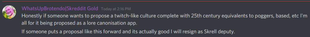 Type: Sub-Culture Short Description: This aims to elaborate on the Human Entertainment Media sub-category of entertainment consumption, specifically in the streaming department, as well as providing slightly more depth to the Social Media concepts currently existing. It will cover four primary categories: Platforms - The popular streaming platforms, as well as how they interact with various legal systems, corporations, and society at large. Most Popular Streamers - This will cover various well-known human streamers, providing a brief summary of their content, their careers, any scandals/controversy, as well as how their fans are typically viewed. Slang - This will discuss popular slang within streaming culture. Genres - Various more general content within the broad overview of streaming, thus that players can elaborate on their own as to their favorite streamers or even being a streamer themselves while still having a loose framework to exist within. How will this be reflected on-station?: It will allow for more detailed discussion of entertainment, as well as adding several new forms of slang and references to be overused by people who are canonically terminally online, which I estimate to be 90% of characters. In addition, it would provide additional ways for players to have their characters exposed to various ideas, ranging from politically radicalizing concepts to ideas in the news beyond simply reading about them in the various newspapers available. Does this addition do anything not achieved by what already exists?: It adds more depth to an existing human sub-culture, which is referenced semi-frequently, but fails to be elaborated on often, as well as offering a loose framework for future developments, hopefully without constraining any creativity on the part of lore developers and players. Also, a Skrell Lore Writer said it was a good idea to do this, and I thought it'd be funny to do it. Do you understand that the project may change over time in ways that you may not foresee once it is handed over to the Lore Team? Absolutely. Long Description: Click Here Additional Notes: I'm not quite sure what to say here, but thank you for taking the time to take a look at this, and I hope it's at least an interesting read, even if it doesn't wind up being accepted. I would like to thank Flpfs (FloppaFan) and Brotendo in particular for taking the time to look at this and give me feedback before I submitted it.