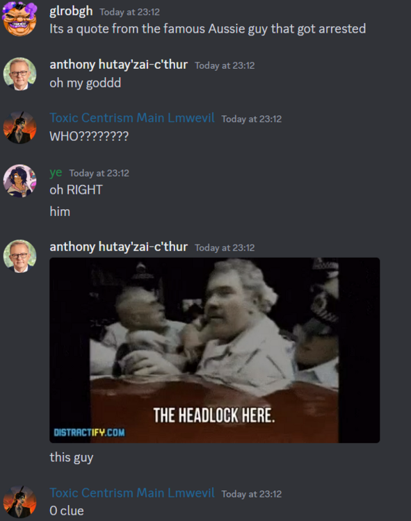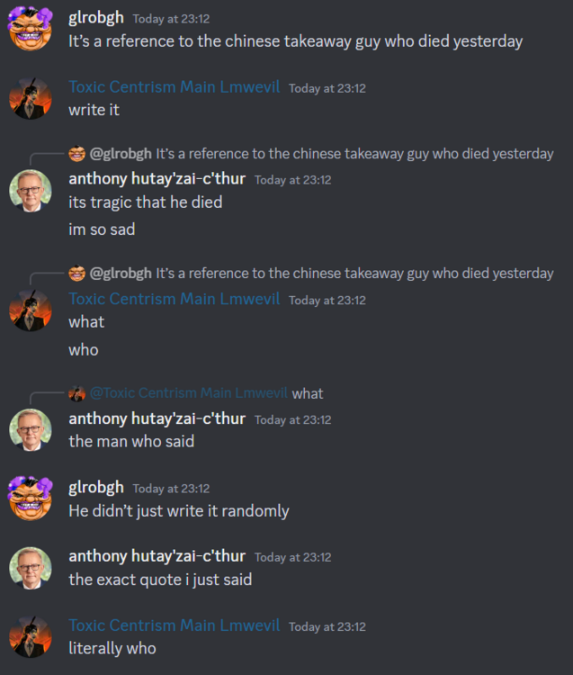 BYOND Key: notagonk (anthony.albanese on discord which i think is more applicable in this situation) Staff BYOND Key: Lmwevil (squidqueen on the discord, which is more useful once again) Game ID: On the main discord server. Reason for complaint: Unfair issuing of a strike. Evidence/logs/etc: For context, a reference to the succulent chinese meal guy was made, and i continued onto the reference by quoting one of the lines he says when he is being arrested. The message in question; The ping which caused the staff member to issue the strike; And the messages which show the staff member was unaware this was a reference to a pretty well-known meme, not seriously talking about genitalia; Additional remarks: I am making this complaint due to the fact I believe the comment I made did not warrant any warning, or break any rules, and that it sets a precedent that the two thousand times the word penis has been used in the server it warranted a warning, or was against the rules. I really just hope that the strike is removed, although I would like to take the chance to comment on the usage of strikes so casually. As a final note, I did ask the complainant if their ping to wevil was a serious issue with my behaviour for the purposes of the staff complaint, but they didn't respond.