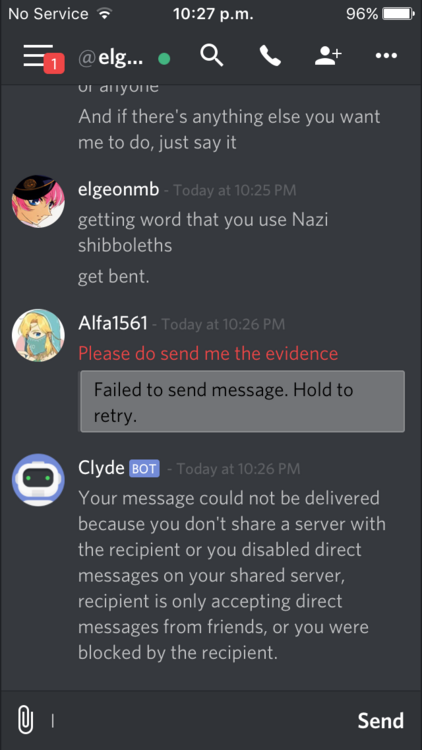 BYOND Key: Alfa1561 Total Ban Length: Permanent Banning staff member's Key: Alberyk Reason of Ban: Banned from another SS13 server for allegedly trying to coerce a minor, which resulted in a ban from here. Reason for Appeal: I have never attempted to coerce a minor. The ban which this refers to is from Polaris, where I was disliked mostly due to my personal views, and then banned from the discord with the DM from the banning moderator "Get bent, Nazi shibboleth." This ban was placed in 2017, when I MYSELF was a minor, which I can prove, so I don't know where this allegation has come from. I am perfectly willing to show staff in a private setting proof of my ID to prove this. The ban from Polaris I never appealed because it was clear I was not welcome there from the actions of that banning moderator. I do not know why suddenly that ban has been applied to me here.