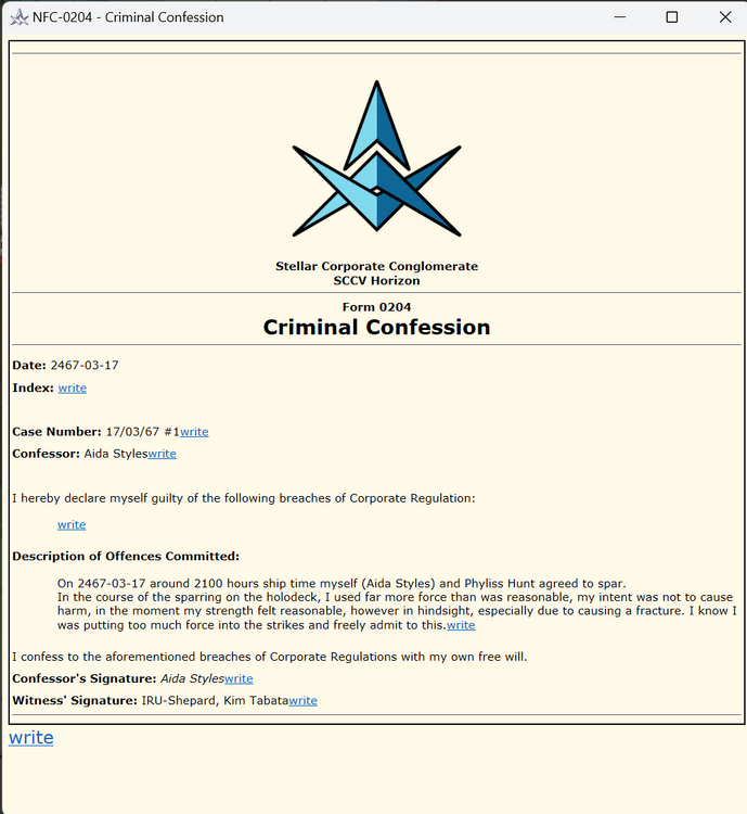 Reporting Personnel: Aida Styles Job Title of Reporting Personnel: Security Officer Game ID: round before cyF-dtFr Personnel Involved: Phyllis Hunt, Investigator- Victim Aida Styles, Security Officer - Offender Lily Zhao - Witness Time of Incident: around 2100 ship time Real Time: 1600 Central time. Location of Incident: Holodeck Nature of Incident: [ ] - Workplace Hazard [x ] - Accident/Injury [ ] - Destruction of Property [ ] - Neglect of Duty [ ] - Harassment [x ] - Assault [ x] - Misconduct [ ] - Other _____ (Place an x in the box that applies. If other, replace line and specify.) Overview of the Incident: Phyliss and myself (Styles) agreed to spar to pass some time. During this spar I fractured one of her head bones (I don't know which.) With hindsight it's clear I used far too much force in my strikes. I'm attaching my statement on my mens rea during the incident in the form of a confession. Submitted Evidence: Crimes left blank, I'm leaving it up to SCCIA to decide if any charges or punishments are warranted. (((Given by myself as styles the next round))) Would you like to be personally interviewed? [ ] - Yes [ ] - No Did you report it to a Head of Staff or a superior? If so, who? If not, why? (Name, Job Title) Actions taken: There was no command at the time. Additional Notes: (If none, leave blank)