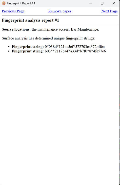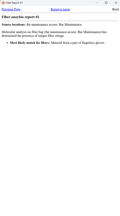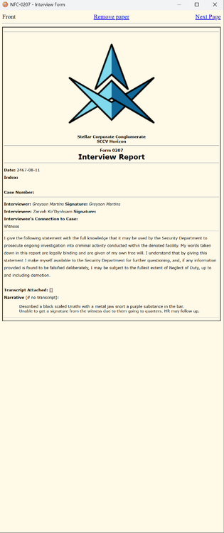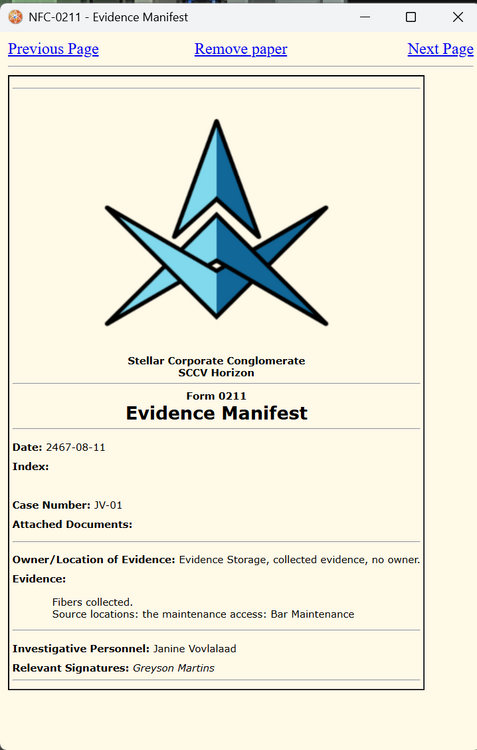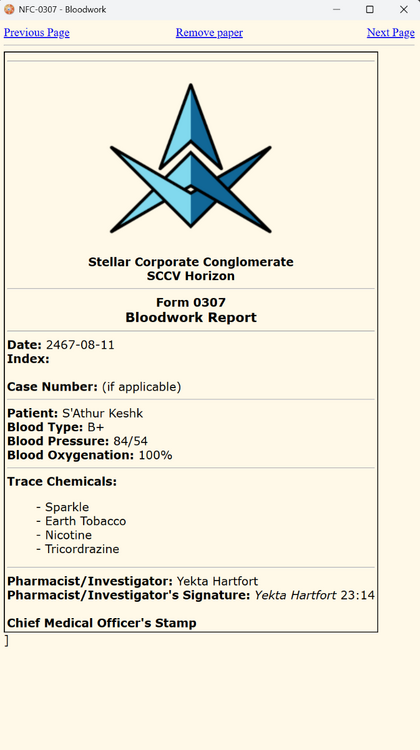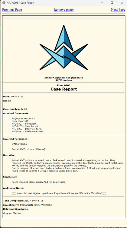 Reporting Personnel: Janine Volvalaad Job Title of Reporting Personnel: Investigator Game ID: cA3-dnJt Personnel Involved: S'Athur Keshk, Janitor- Offender Zarvah Kir'Dynhsam, Bartender - Witness Time of Incident: 22:00 (Approx. based off my Case Report notes) Real Time: Location of Incident: Bar Room (Private area, not the lounge) Nature of Incident: [ ] - Workplace Hazard [ ] - Accident/Injury [ ] - Destruction of Property [ ] - Neglect of Duty [ ] - Harassment [ ] - Assault [x ] - Misconduct [x ] - Other Biesel Law Violation Overview of the Incident: Officer Jackson informed us over the security radio that Zarvah Kir'Dynhsam witnessed potential illegal drug use. I (Janine Volvalaad) moved to the bar to question the witness. Summary of her testimony is provided under evidence, she went to quarters before I could have her confirm and sign it. She informed me she witnessed an Unathi snort a purple powder, before leaving the bar via the aft Maintenance door. I collected fibers and fingerprints from the bar side of the door in question, the result was two finger prints. One of the fingerprints was a partial match for S'Athur Keshk, I located S'Arthur Keshk and observed that his attire and scale complexion matched the description. Janitor is also one of the assignments who's access could open the Bar room maintenance door. Based on this circumstantial evidence, a search warrant and blood test was authorized. Officer Jackson executed a search and found a bottle of Mortaphenyl pills. I then escorted Keshk to medical and Yekta Hartfort retrieved and tested a blood sample for illegal substances. The results indicated Keshk had ingested Sparkle. Keshk was arrested but due to an unrelated event, some confusion occurred. As such Mister Keshk's incident description is very inaccurate. There was not time to conduct an interview with Keshk. (((It was a wild ling round and during the search of Keshk in processing we found a syringe with mindbreaker and all kinds of other bad stuff, that looked like an Antag concoction. Sparkle might have been in maintenance but my OOC instincts say the syringe was antag related. The officer processing Keshk didn't know about my investigation and I think processed it like an antag charge maybe. The warrant was also never approved because the HoS insisted that I could just do the search because we were on blue. We were on blue for the lings, unrelated (probably) to Keshk.))) Submitted Evidence: (Ignore the signatures I forgot to reset my signature. Greyson Martins == Janine Volvalaad I neglected to add the mortaphenyl pill bottle to the manifest. I neglected to include the description of the Unathi's attire, a dark jacket made of what looked like leather. Would you like to be personally interviewed? [ ] - Yes [ ] - No Did you report it to a Head of Staff or a superior? Yes, Mari’ri Azumara Actions taken: An arrest was affected, however the incident description is in error. Additional Notes: