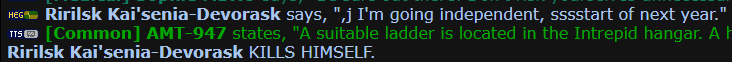 Hi, I was the secoff during the latter half of that round. To add onto what Loorey said, acting as security while non-security is reserved for the worst of circumstances, and generally requires a good in-character reason to do so regardless. Situations that aren't mass-cas(ualty) often don't warrant a citizen's arrest unless you have strong reason to believe there's going to be mass-cas in the very near future with no one to stop it—even so, you need to get into the logistics of it. Medical student is presented with a hostage situation, decides to break into the armory or find a gun, go gung-ho around the antagonist to scare them off? Even in a hypothetical scenario where this works and no shots are fired, this is stretching the limit of what a reasonable person would do, particularly one with so much to lose and not a whole lot to gain. Hostages are already a huge bargaining chip that stops normal security from antagonizing them without a well thought-out plan, factoring in power armor and military-grade weaponry and even common sense and it's no contest. When there doesn't exist any security on or off-duty, there's usually slack given in order to interact with the antagonist; this more means you can act with hostility towards them, not that you can gear up past bare essentials (which usually means what's on your person/what a reasonable person would take with them to minimize injury to themselves). Hostages, like the ones mentioned during the round (though I don't have the full story), can organize break outs particularly in severe circumstances like this. I've been spoken to a few times about acting as security in non-security positions, and it really is highly situational. Off-duty Vedhra warrior for hive K'lax, sees horrorform changeling and thinks its Lii'draic? Feel free to engage, but be on the defense more than offense. On-duty bartender with security too busy to handle what might be a vampire? Put down the bat and get some fear RP going on. When red alert is called, that usually means all bets are off and you can assume that things are about to be fucked if they're not already, but still try and wait for guidance from your other crew members, if not a head of staff (and as Loorey said, ahelp to be sure). More OOCly, it's just not a good idea to play the hero as medical, especially if you're the only one in the department. People, including antagonists, rely on you to make sure no one dies or is kept out of the round for too awfully long. This doesn't mean you should be a doormat, but think of a scenario where another non-security character might pick up a weapon, and restrict yourself to something twice that severity before you opt into that kind of play. You'll eventually learn to play it by ear and figure out when it would be reasonable to rush into the defense and blast them to bits, but it's exceedingly rare and needs to be justified up the wazoo before it can be considered.