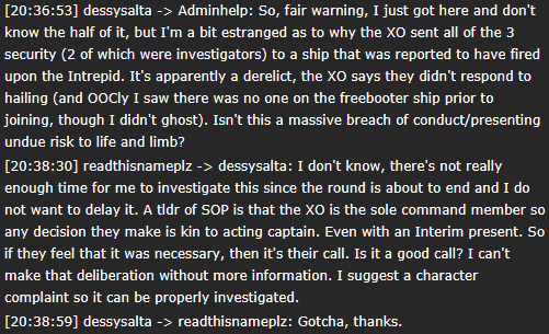 BYOND Key: Dessysalta Game ID: ctt-cQyV Player Byond Key/Character name: Osisra Devorask Staff involved: ReadThisNamePlz (She told me to make a complaint since this was ~5 mins til roundend and didn't want to delay it.) Reason for complaint: Osisra Devorask, on an autotraitor round, got a report that the Intrepid had been fired upon while 3 security members (2 of which were investigators) were present on the Horizon. This led to the XO calling for all 3 of the only security on board to the Intrepid (or Canary), gearing them up for an assault and then sending them to the ship in question. As a note, I think this was later into the round when they confirmed the ship was "drifting" and didn't respond to attempts to hail (come to find out, the reactor had detonated and the captain on the freebooter vessel cryo'd). This was bizarre and I've been ahelped/talked to for doing roughly the same thing previously. Given all I saw when I got there was all of our security gone and 5 greimorians about, I tried to ask ICly what occurred and then ahelped to see if we could get some further info. My thought process is, with only 3 security present and the ship having been assumed to be vented/a derelict and thus not worth checking out, why send anyone at all, especially when there had previously been a threat on board and we were so understaffed? Doesn't this just needlessly risk life and limb? Apologies if all of this is a bit jumbled or disorganized. It wasn't at all expected from my perspective, and I barely had time to adjust. Did you attempt to adminhelp the issue at the time? If so, what was the known action taken by administration/moderation? Yeah. Here's the contents of our ticket. Approximate Date/Time: 04/29/2024, about 5 PM EST? DISCLAIMER: I swear I don't mean any of this in bad blood, I'm not trying to get anyone in trouble, but I was told to make a character complaint so a proper investigation could be opened just in case this was out of line. I said in the ticket and I'll say it here, I got there about 20 minutes until the end of the round, I know literally nothing.