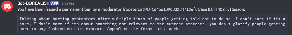 BYOND Key: Cash7800 Staff BYOND Key: Roostercat Game ID: Reason for complaint: I never talked about harming protestors, the topic of conversation just reminded me of this thing I remembered where some french firefighters set themselves on fire in all their firefighter gear and then put it out and I thought it looked cool, I don't think they were hurt and I have never made any statements glorifying or condoning violence against protestors. I wasn't aware this topic of conversation was such a big issue in the discord recently, and when Fyni told us about it I deleted the picture I had posted, found in the article below. I don't really think it's graphic or anything though. Evidence/logs/etc: Here is the article where I found the picture for reference https://www.theguardian.com/world/2020/jan/28/french-police-clash-with-firefighters-during-paris-protest Additional remarks: Here is the ban reason: