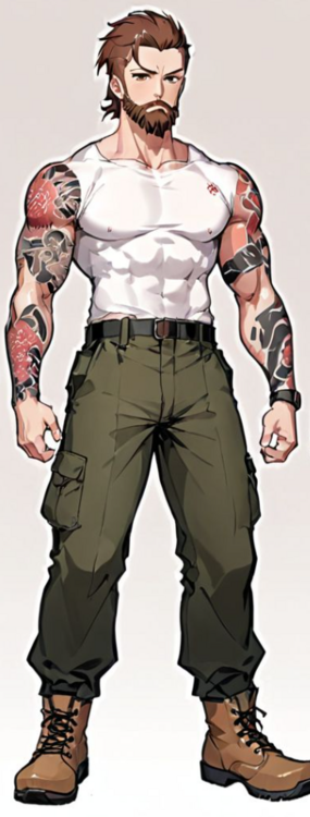 hey! I'd love if you sketched Wojtek! He's a large, muscular dude, with an undercut and a beard. Very masculine kind of guy, sharp face, soft eyes kind of thing. Best way to describe it would be like someone who body builds but not at a massive level. refs attached are for colors and vibes!