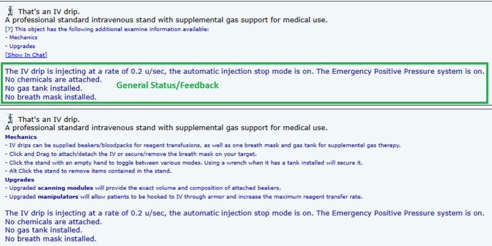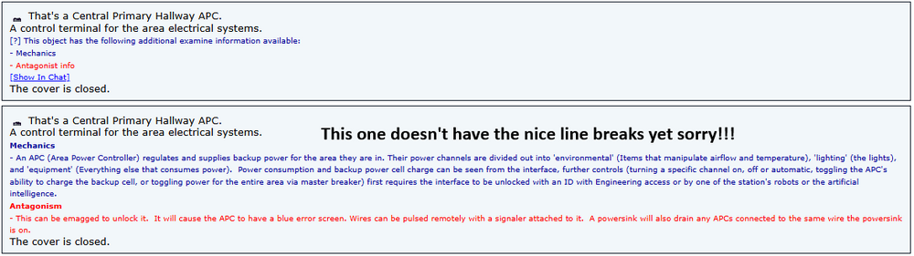So I've been playing on Aurora like three months, and this is a place with some seriously opaque mechanics, and it often demands I wiki dive or even code dive to figure out how to do something or if I even CAN do something. While people are very supportive of each other when it comes to helping with mechanics (since it seems like Everyone Suffers), ideally you should be able to examine an object and receive all the information you need about how to interact with it in any common capacity. While many objects do have some 'show additional information' text, it is not implemented consistently. There are several different types of information that would be very useful to have when examining objects, which I have broken down by function below: [Name] [Damage/Condition]* [Description] [Extended Description]** [Mechanics]** (how do i X) [Assembly/Disassembly]** (what tools to use) [Upgrades]** (science has a point?) [Antagonist Interactions]** (if the user is an antagonist/observer) [General Status/Feedback] * - If the object is damaged. ** - If the user clicks the '[Show in Chat]' button. This is currently a WIP. There is a PR for this where implementation feedback can be provided, but this forum thread is intended for UI feedback and how it looks/feels presents. I have laid some groundwork for this update already, and [Show in Chat] already gives you better information on many objects, but the following are some screenshots from both live in-game and my WIP branch for your consideration. Please disregard minor style differences between screenshots, they were taken at different times and stages.