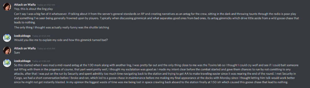 BYOND Key: Rickymadenson Game ID: cbF-ab6K Player Byond Key/Character name: Icedcabbage/Anderson Bhander Staff involved: No Reason for complaint: The reason why I'm making this complaint is because I'm tired off this sort of gimmick style, and unfortunately, icedcabbage is my pick for this complaint, since they're among what I consider the worst offenders for this. Anderson Bhander was a miner (later turned out to be a ling) who reported they were losing oxygen and required rescue. Security, early on, noticed the man hanging out outside toxins without a suit, but initially assumed it was a glitch/accident with his suit, and left the matter to responders. Anderson Bhander would proceed to issue a threat over the radio, warning the vaurcae who attempted to rescue him to stand back (which they presumably did not), allowing Bhander to break through and eventually kill them. This prompted an hour long manhunt for an antagonist who as for as they eye could tell from afar, simply hid away from security and issued several verbal taunts and threats to toy around with the crew (especially security for that matter I should add for the failure to stop him). At the end of the round, Bhander decided to hitch a ride with the shuttle (by latching onto it outside, which I thought was pretty cool, albeit kind of silly form a narrative perspective given ODIN's security). My main issue is was lack of a driven narrative that antagonists are typically supposed to provide. I understand that not everyone gets to partake in it, and sometimes this narrative takes place between a small set of people who encounter the antag, but this time I hardly believe there was much of a huge plan aside from a kill confirm and "hide to see how long it takes to get caught" playstyle. I will say that while trying to acquire logs of the rounds, icedcabbage offered the time to discuss the matter through DMs to lay down his perspective (which I dearly appreciated), though his explanation on the matter left me with little to work with. It's come to my intention that this playstyle is NOT new to him, and while he explained that it sort of was a spontanuous incident of getting lost in space for a moment, hampering his opportunity to engage with the station, it doesn't change the fact that even during his time on-station, he still opted for this playstyle after he had his kills. I'll leave our DMs here, as icedcabbage themselves gave approval to me for sharing them as well as his reasoning for allowing it. Did you attempt to adminhelp the issue at the time? If so, what was the known action taken by administration/moderation? No, because I believe this to be a problem on a wider issue rather than a single incident, and an ahelp would not help staff with conducting an investigation on that scale. Approximate Date/Time: 21-4-2021 3-4 AM UTC + 1