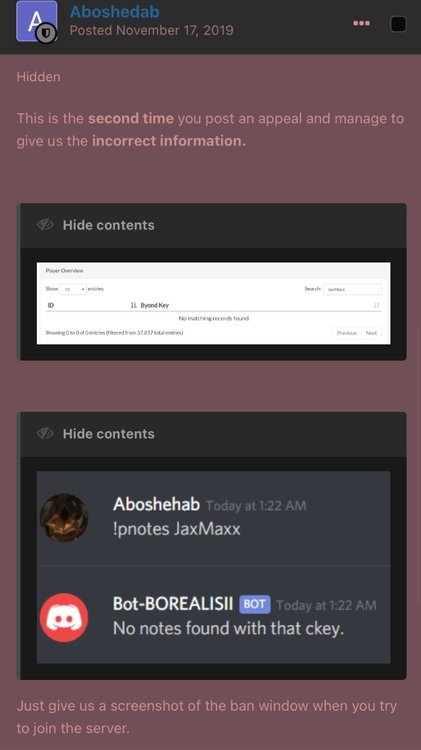 The issue isn’t the ban reason itself. The issue is why you appealed twice with incorrect information and then ghosted the appeals. Even now this current appeal information does not match anything you shared before except perhaps the similarity between the account name of this appeal and the previous one. Appeal 1 Appeal 2 I want you to explain why these two appeals came to be with incorrect information and no correction was made when we asked for it.